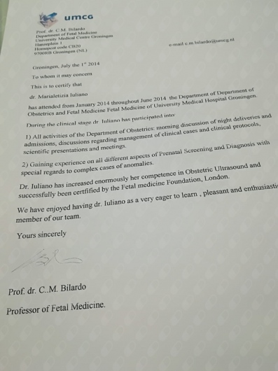 Nel 2014 parte per un internato clinico all'ospedale di Groningen (NL), centro di riferimento olandese per la patologia neonatale; qui le vengono conferiti diplomi internazionali per l'ecografia ostetrica.