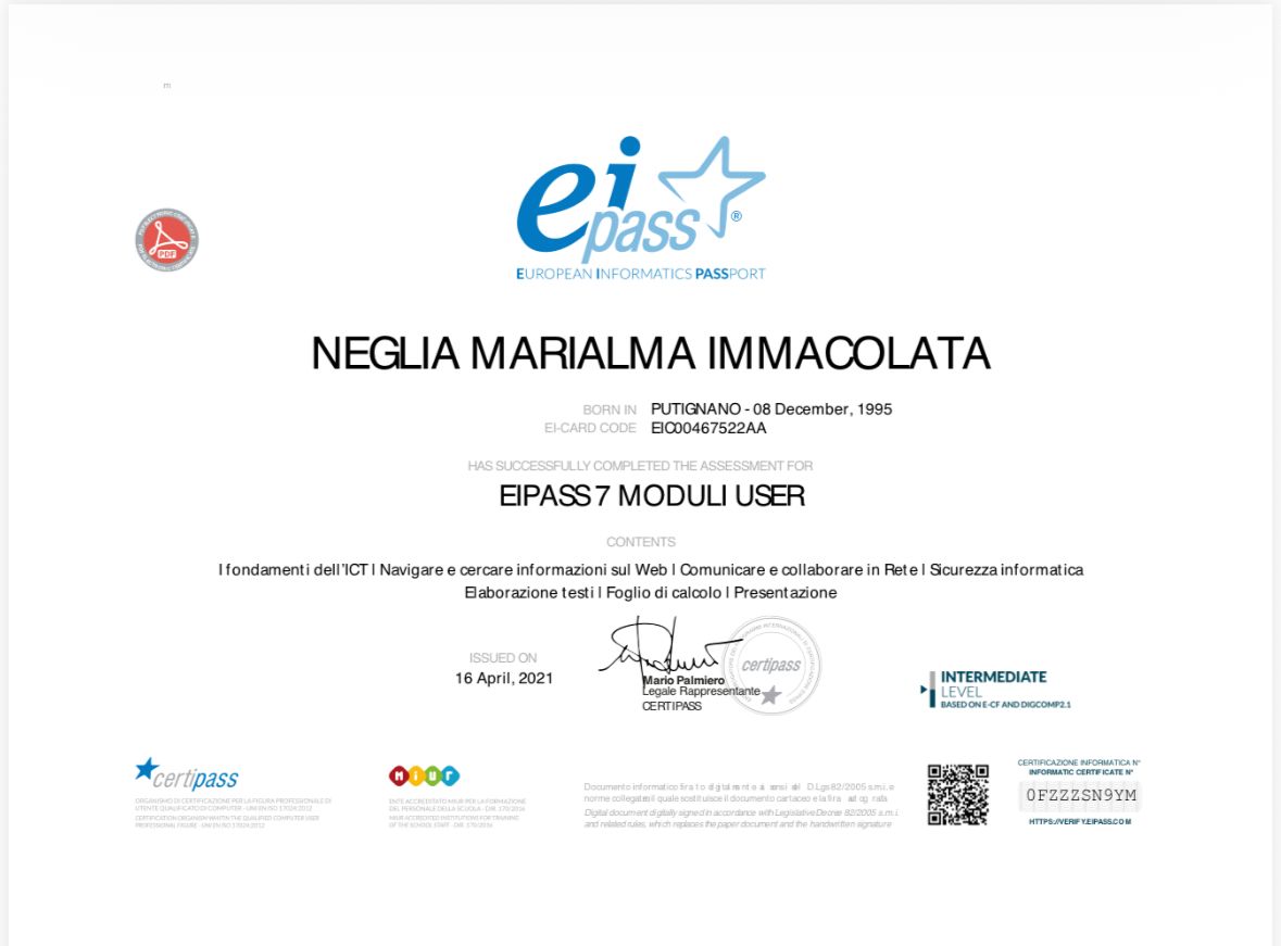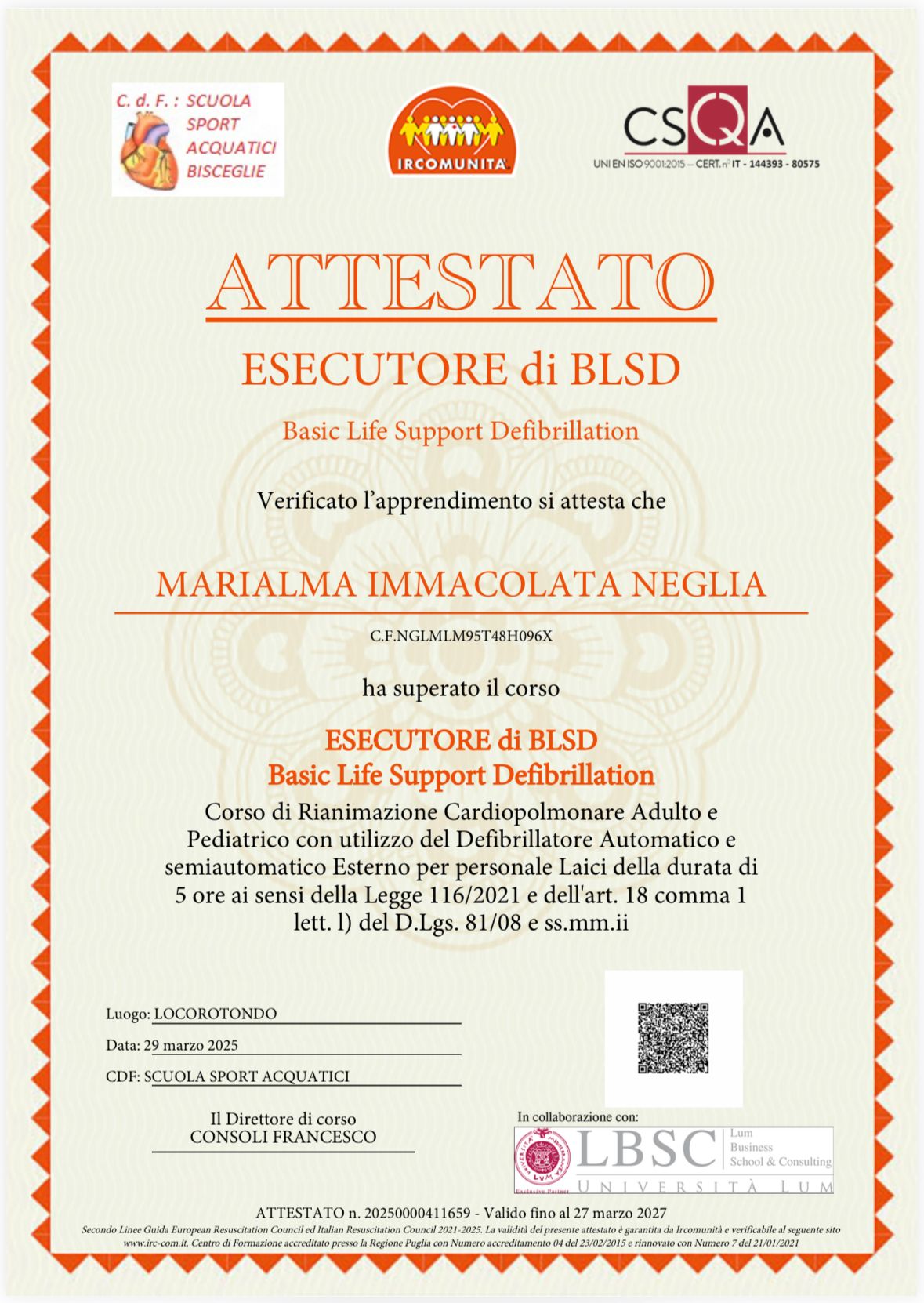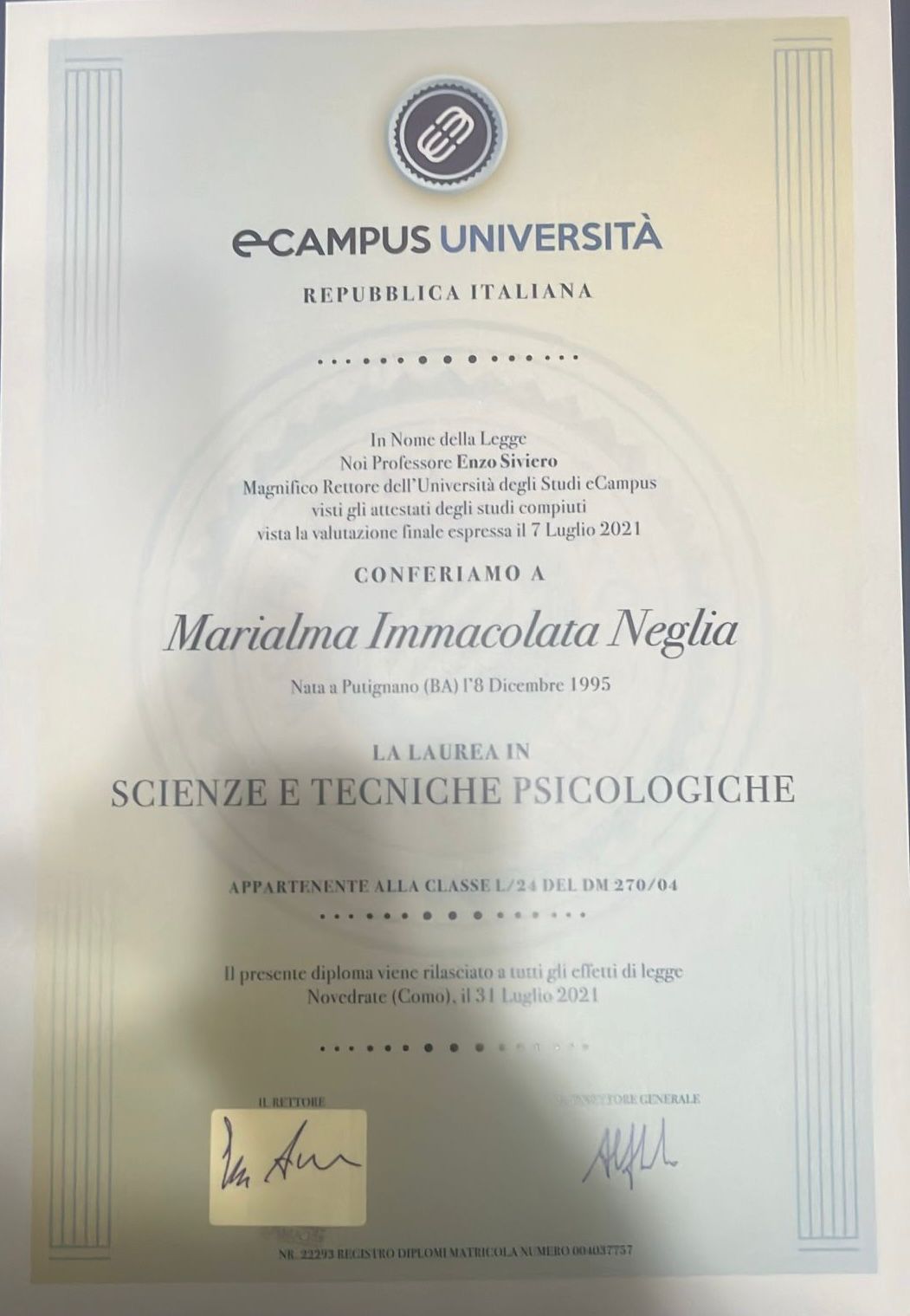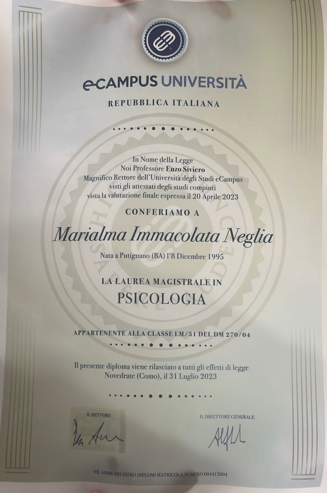 Mi chiamo Neglia Marialma Immacolata, sono laureata in Psicologia Clinica e
