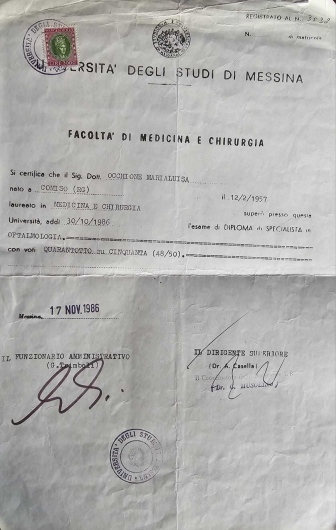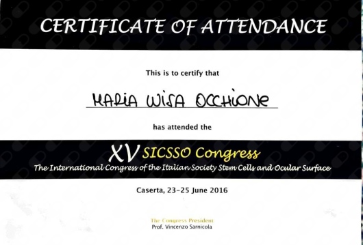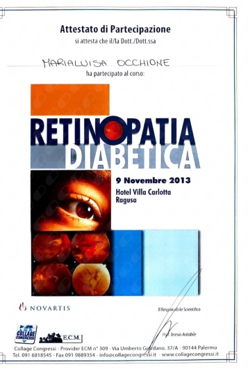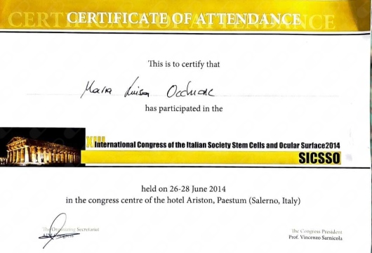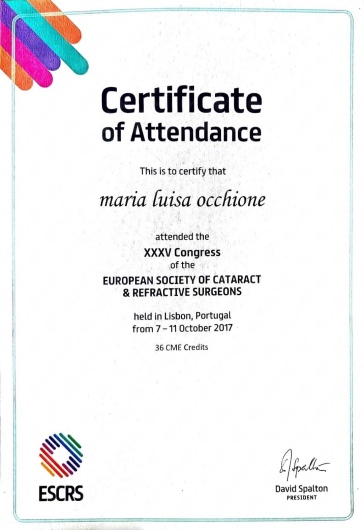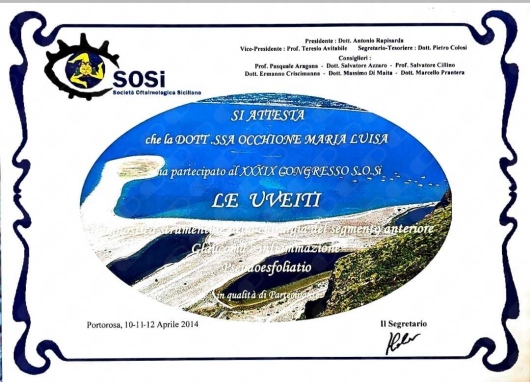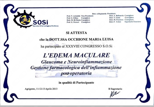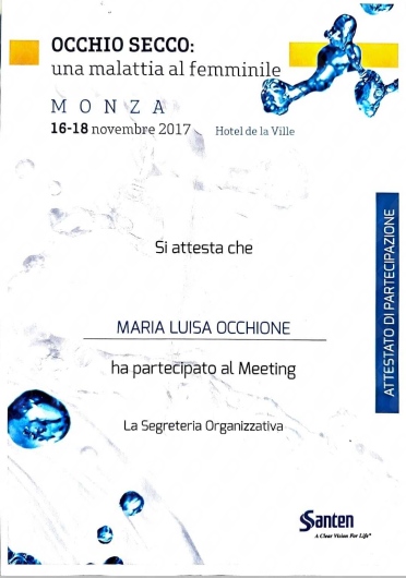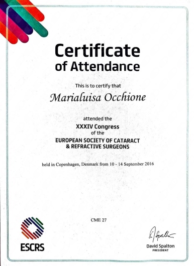 La Dottoressa Marialuisa Occhione è scritta ad associazioni scientifiche nazionali di Oftalmologia SISO E AIMO. Ha da sempre curato l'aggiornamento professionale partecipando a numerosi congressi di oculistica sia in Italia che all'estero. E' principalmente specializzata in patologie del segmento anteriore dell'occhio, diagnosi precoce di glaucoma e retina medica.