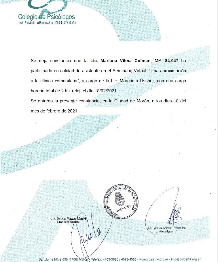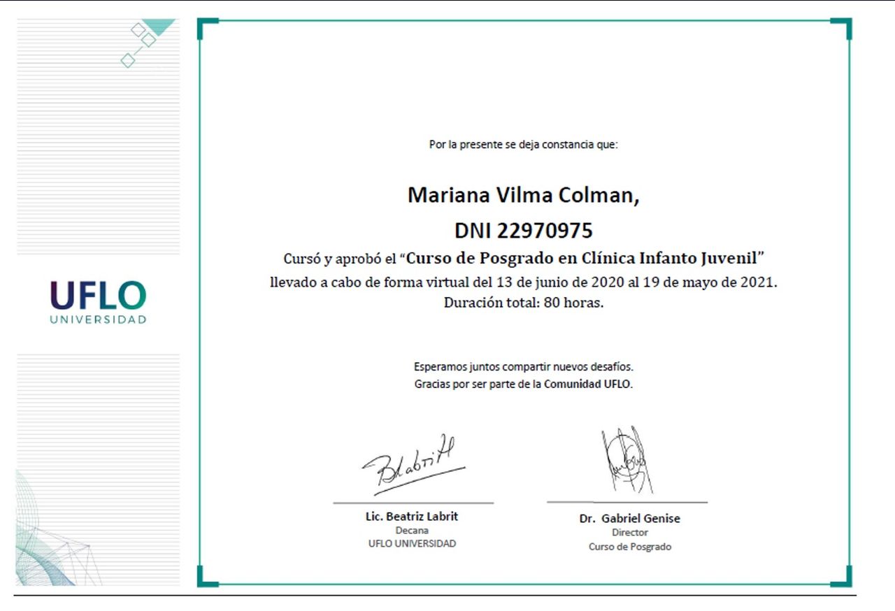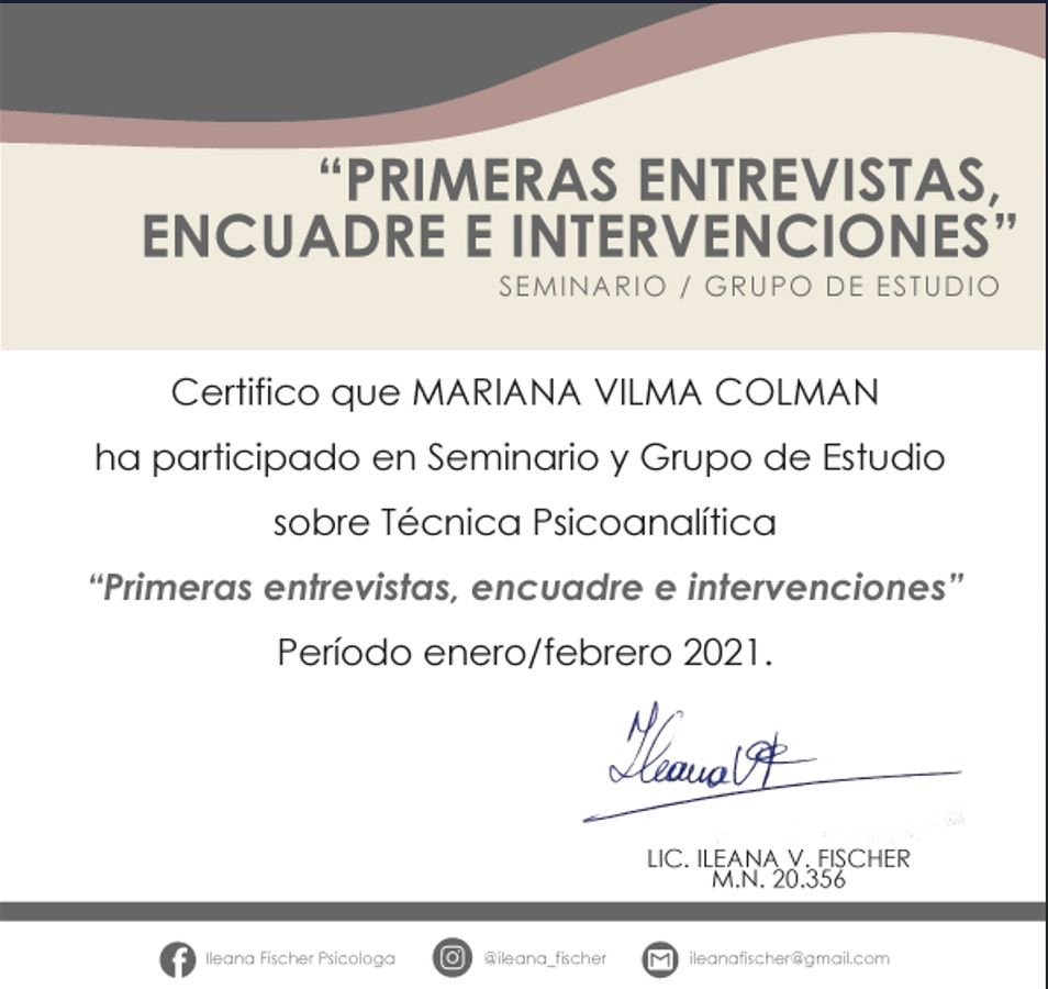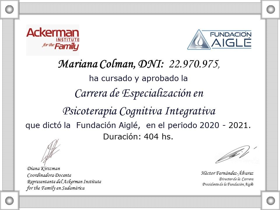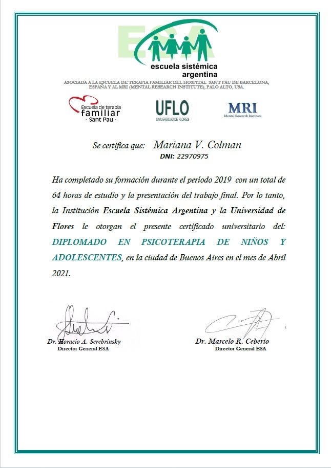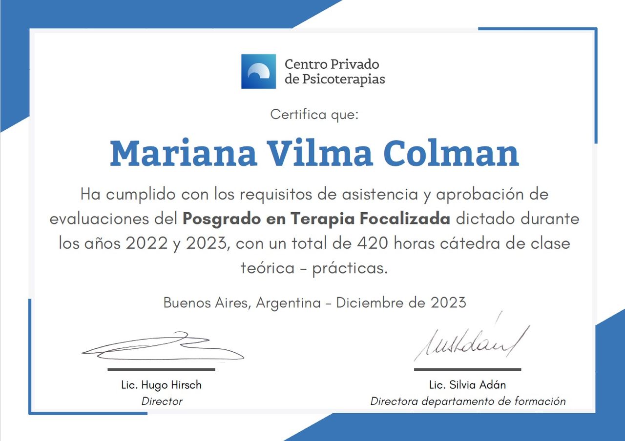 Sono psicologa e psicoterapeuta, formata in Argentina. Mi sono laureata in Psicologia presso l'Università Kennedy di Buenos Aires e specializzata in psicoterapia presso l'Università di Mar del Plata. La mia laurea è stata riconosciuta in Italia nel 2005.