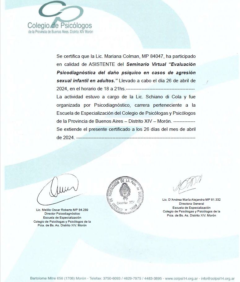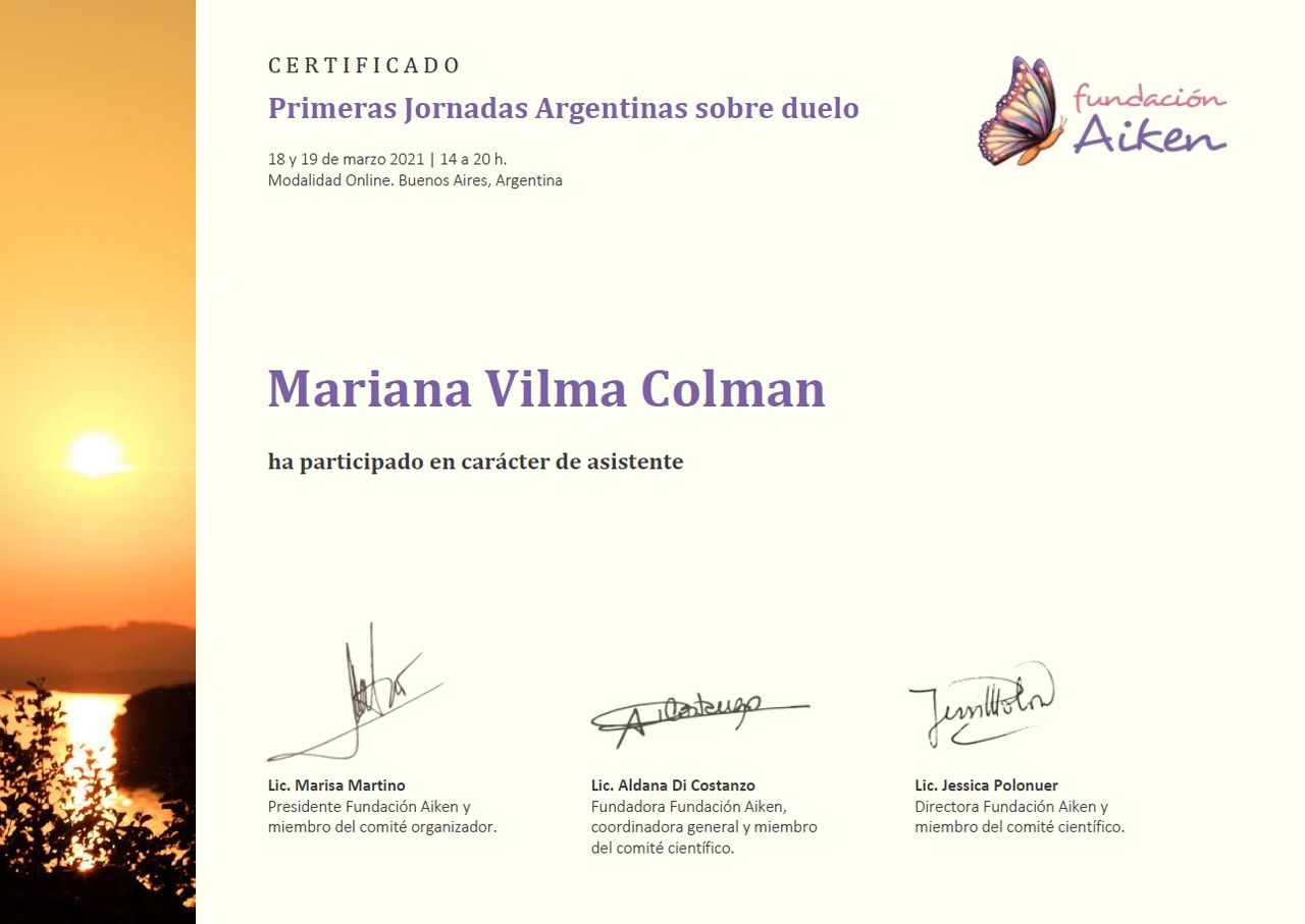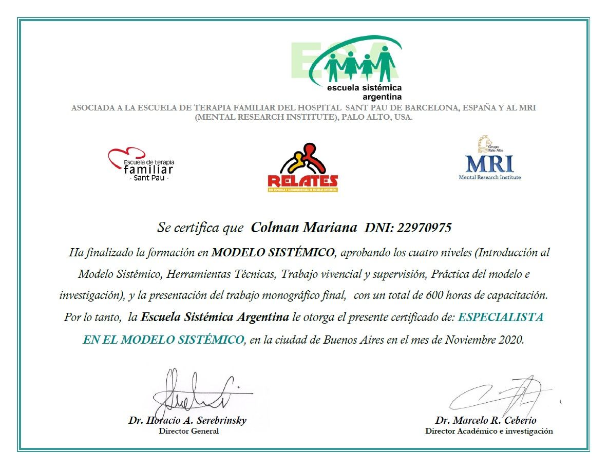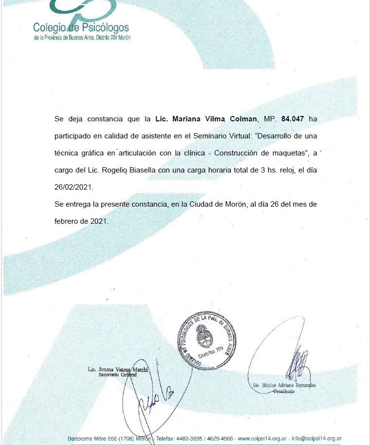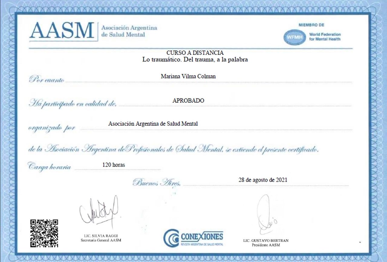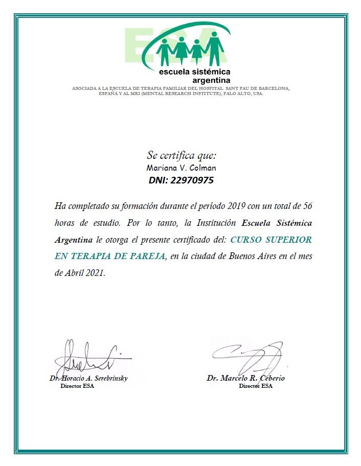 Sono psicologa e psicoterapeuta, formata in Argentina. Mi sono laureata in Psicologia presso l'Università Kennedy di Buenos Aires e specializzata in psicoterapia presso l'Università di Mar del Plata. La mia laurea è stata riconosciuta in Italia nel 2005.