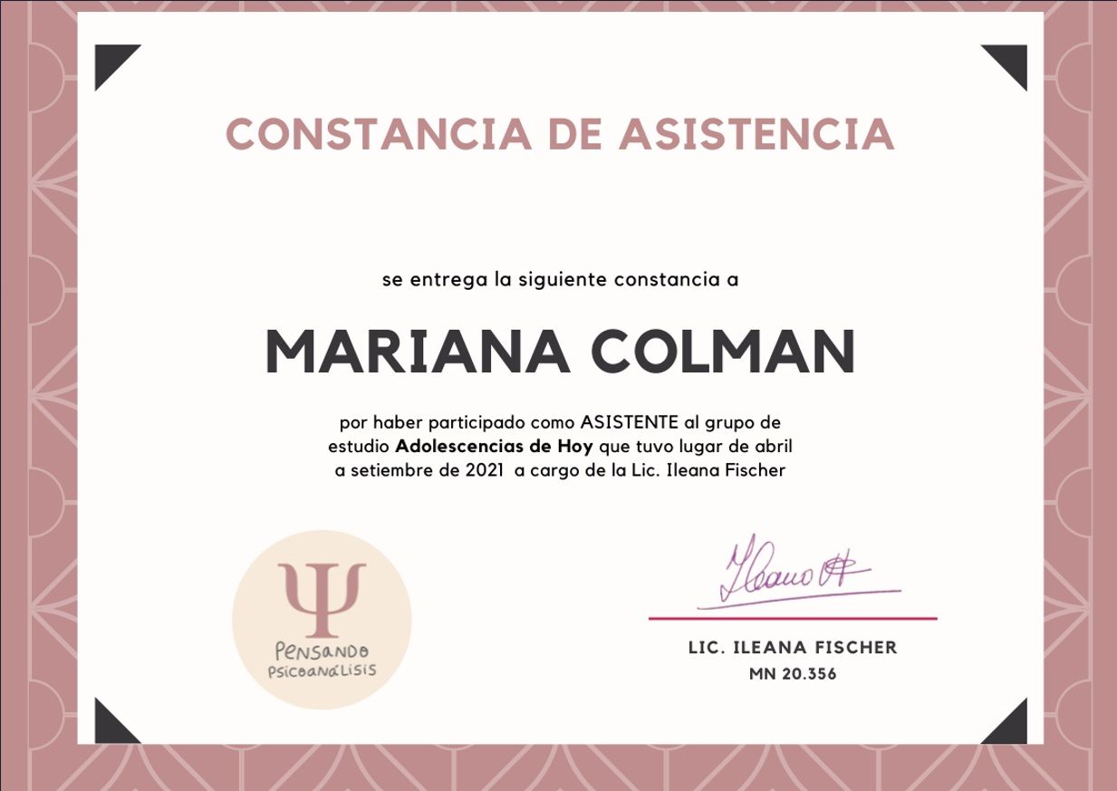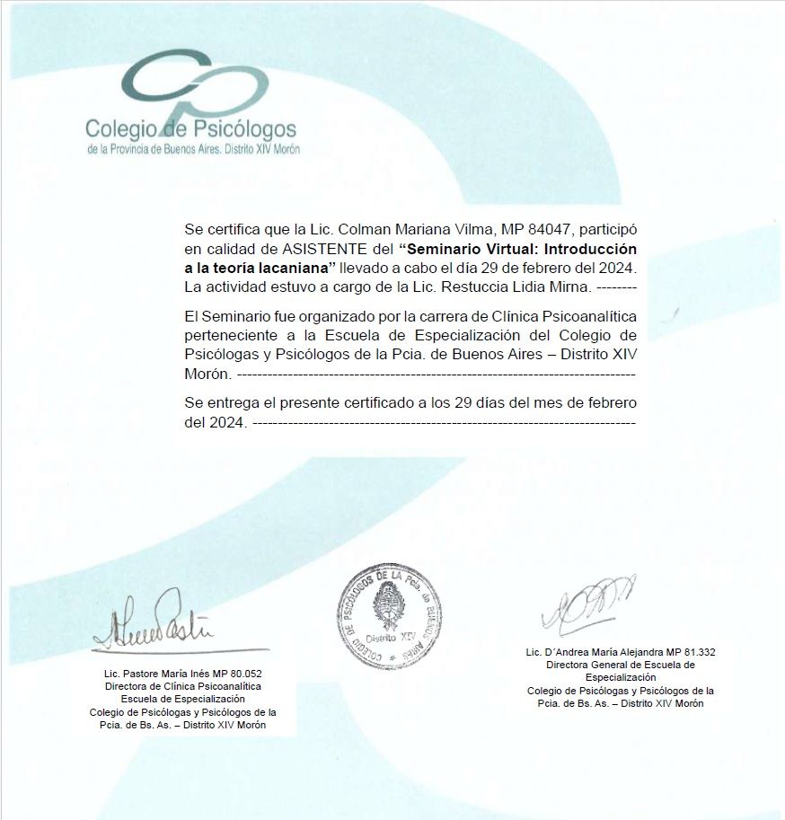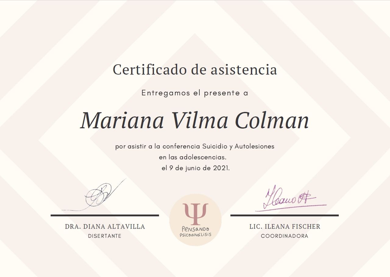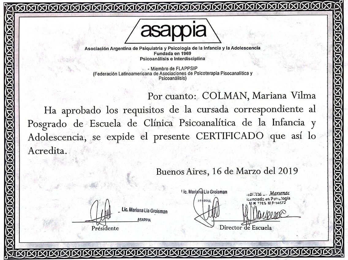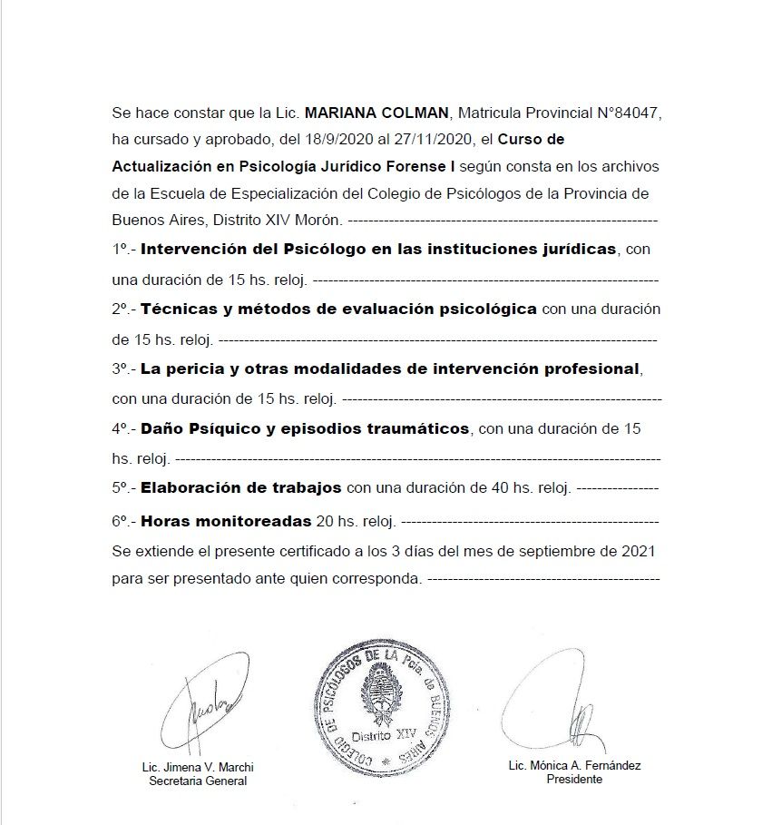 Sono psicologa e psicoterapeuta, formata in Argentina. Mi sono laureata in Psicologia presso l'Università Kennedy di Buenos Aires e specializzata in psicoterapia presso l'Università di Mar del Plata. La mia laurea è stata riconosciuta in Italia nel 2005.