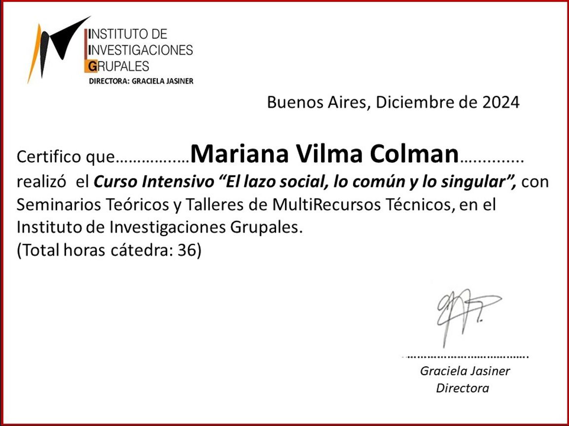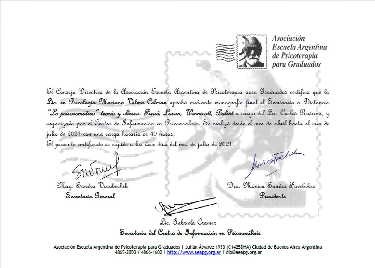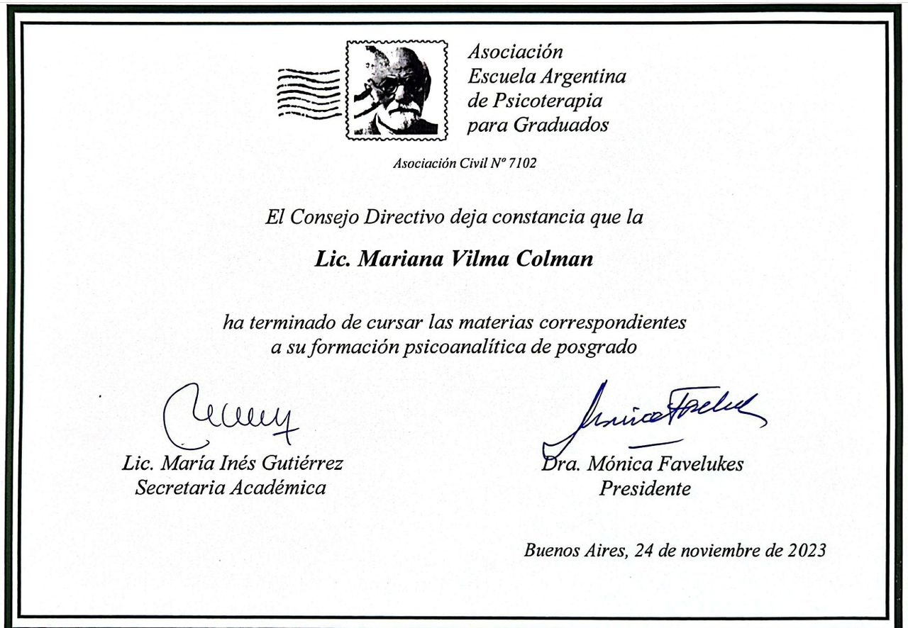 Mi sono formata in psicologia clinica, psicodiagnosi e psicoterapia in istituti prestigiosi di Buenos Aires (Asappia, ESA, Aiglé, AEAPG, COLPSI XIV). Da oltre 15 anni accompagno adulti in percorsi di sostegno psicologico, crescita personale e superamento delle difficoltà emotive.