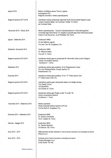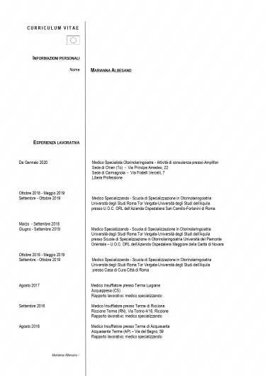Dopo essermi laureata in Medicina e Chirurgia nel 2014, ho svolto un periodo di tirocinio obbligatorio presso un reparto ORL e, proprio in seguito a questa esperienza, ho deciso che quella sarebbe stata la mia strada. Mi sono specializzata in Otorinolaringoiatria presso la scuola di specializzazione di Roma Tor Vergata nel 2019. Ho frequentato, durante il percorso di specializzazione, l'unità complessa di Otorinolaringoiatria dell'Ospedale Maggiore della Carità di Novara e dell'Ospedale San Camillo-Forlanini di Roma. Lavoro in Piemonte dal 2020 come libera professionista, presso strutture private e private convenzionate, dove svolgo attività ambulatoriale e chirurgica. Con alcuni colleghi, nel 2022 e nel 2023, ho lavorato come volontaria presso il Consolata Hospital di Ikonda, in Tanzania, e questa è stata una delle esperienze più intense e incredibili della mia vita! Ho partecipato a diversi corsi di dissezione chirurgica ORL presso l'Istituto di Anatomia di Torino, prima come discente e, successivamente come docente. Collaboro spesso con i colleghi Odontoiatri, nell'ambito della patologia di confine.