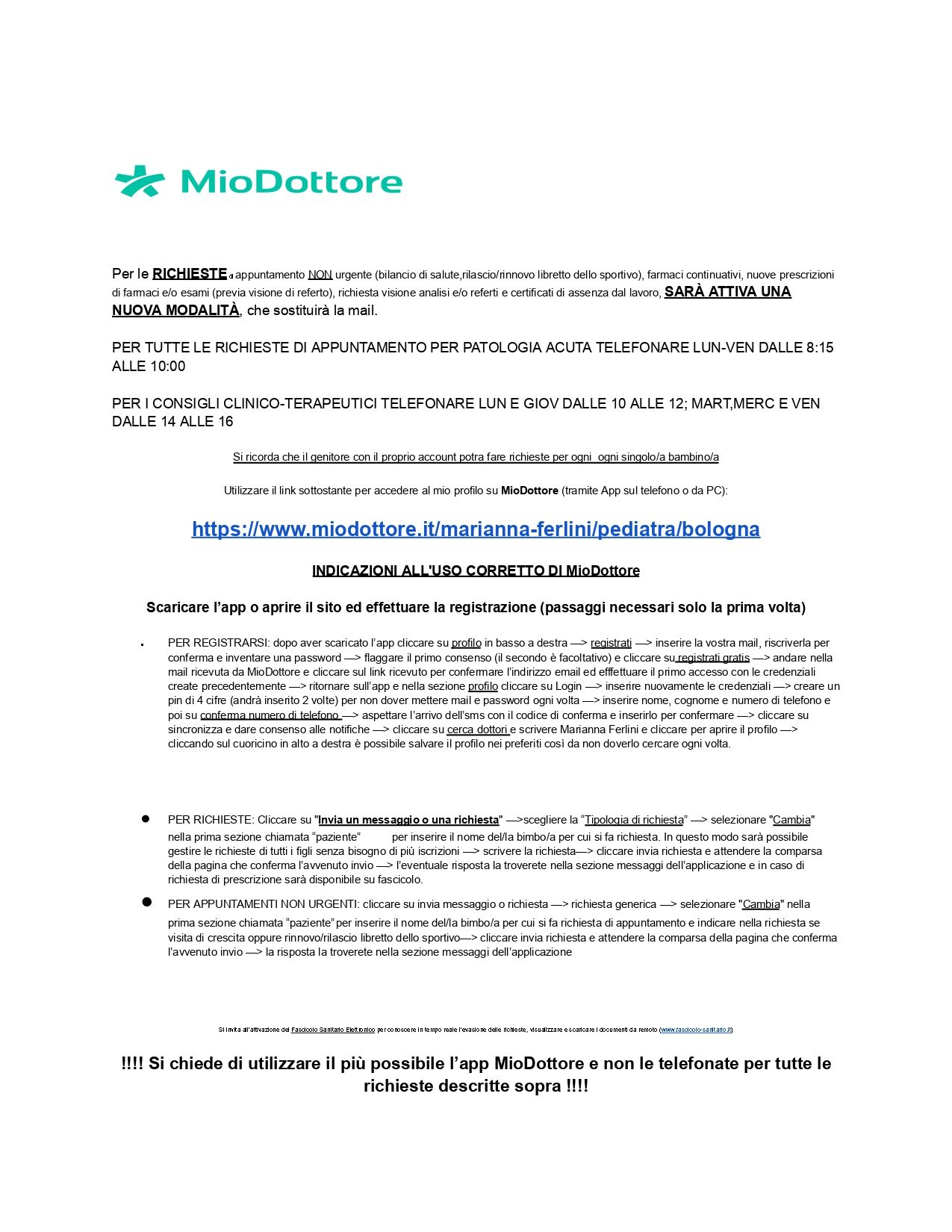 - Tramite la piattaforma MioDottore (attraverso il tasto "invia messaggio/richiesta", poi indicando con "cambia" il nome del bimbo per cui si fa richiesta), è possibile fare richiesta di farmaci e visite specialistiche, condividere foto e documenti, far visionare referti al medico, richiedere appuntamento per visite NON urgenti (bilancio di salute, rilascio/rinnovo del libretto dello sportivo). La Dott.ssa risponderà alla richiesta entro 24-48 h di giorni lavorativi (cioè esclusi festivi e prefestivi).
