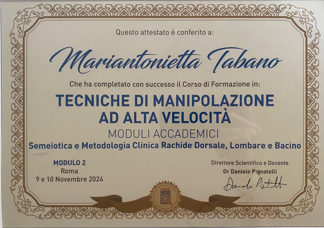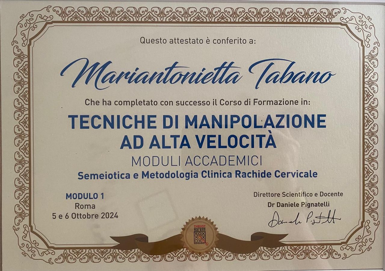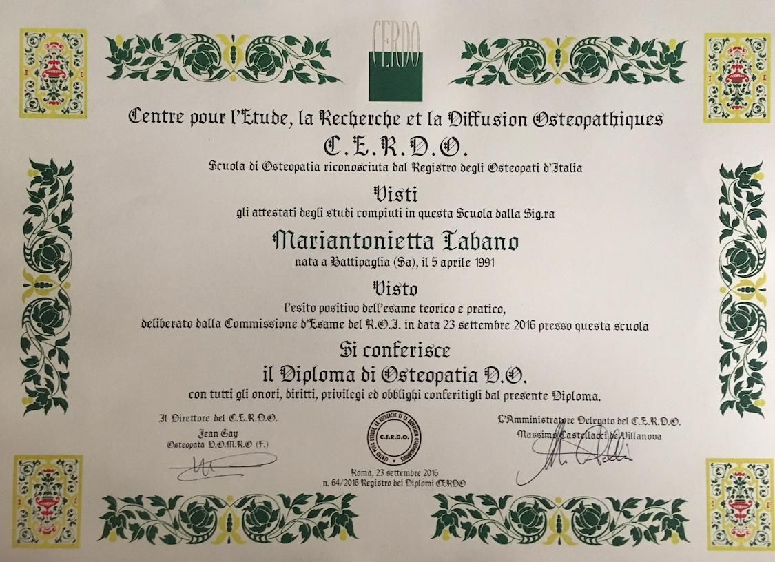 Dopo 6 anni di formazione presso il C.E.R.D.O. a Roma, ho conseguito il riconoscimento Italiano D.O. (Diploma in Osteopatia) e il riconoscimento Francese D.O.A. (Dottoressa in Osteopatia Atman). Successivamente, ho ottenuto la certificazione come Terapista Metodo Renata França.