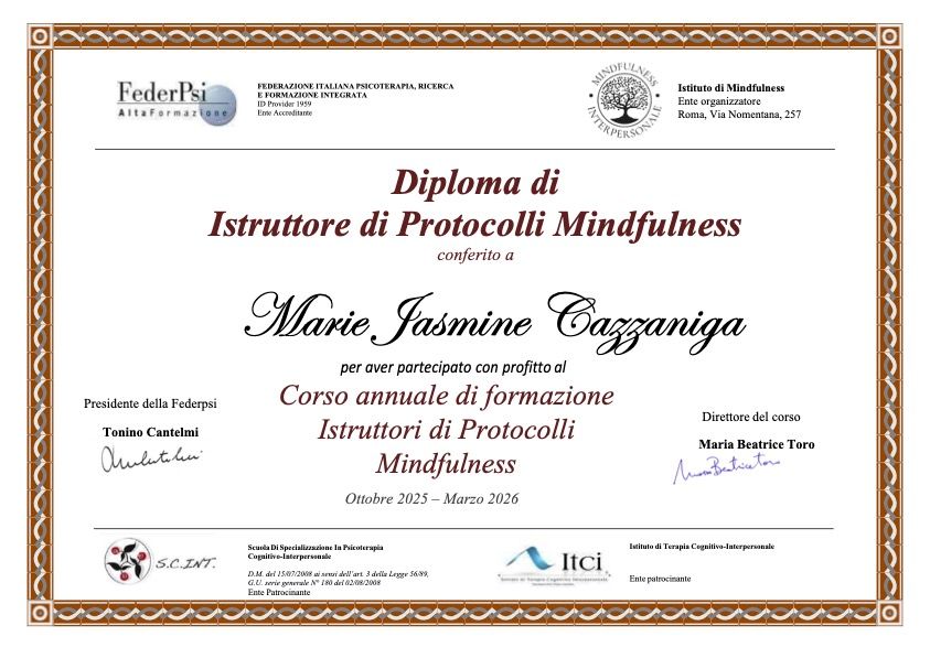 Sono iscritta al Registro Nazionale Mindfulness con numero 3072: https://www.albonazionalemindfulness.it/professionista/marie-jasmine-cazzaniga