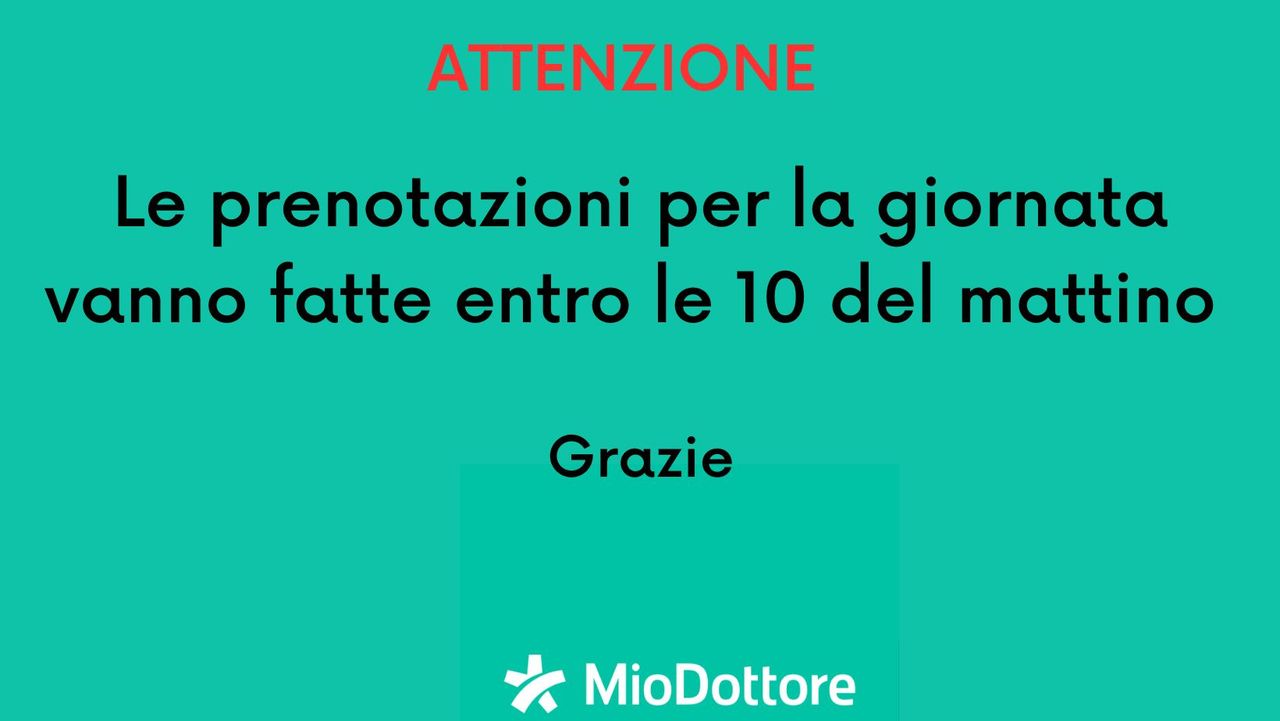 IL MARTEDI' E IL VENERDI' LA FASCIA ORARIA 9-9.30 E' RISERVATA AI SOLI INFORMATORI FARMACEUTICI. LA PRENOTAZIONE DI PAZIENTI VERRA' CANCELLATA