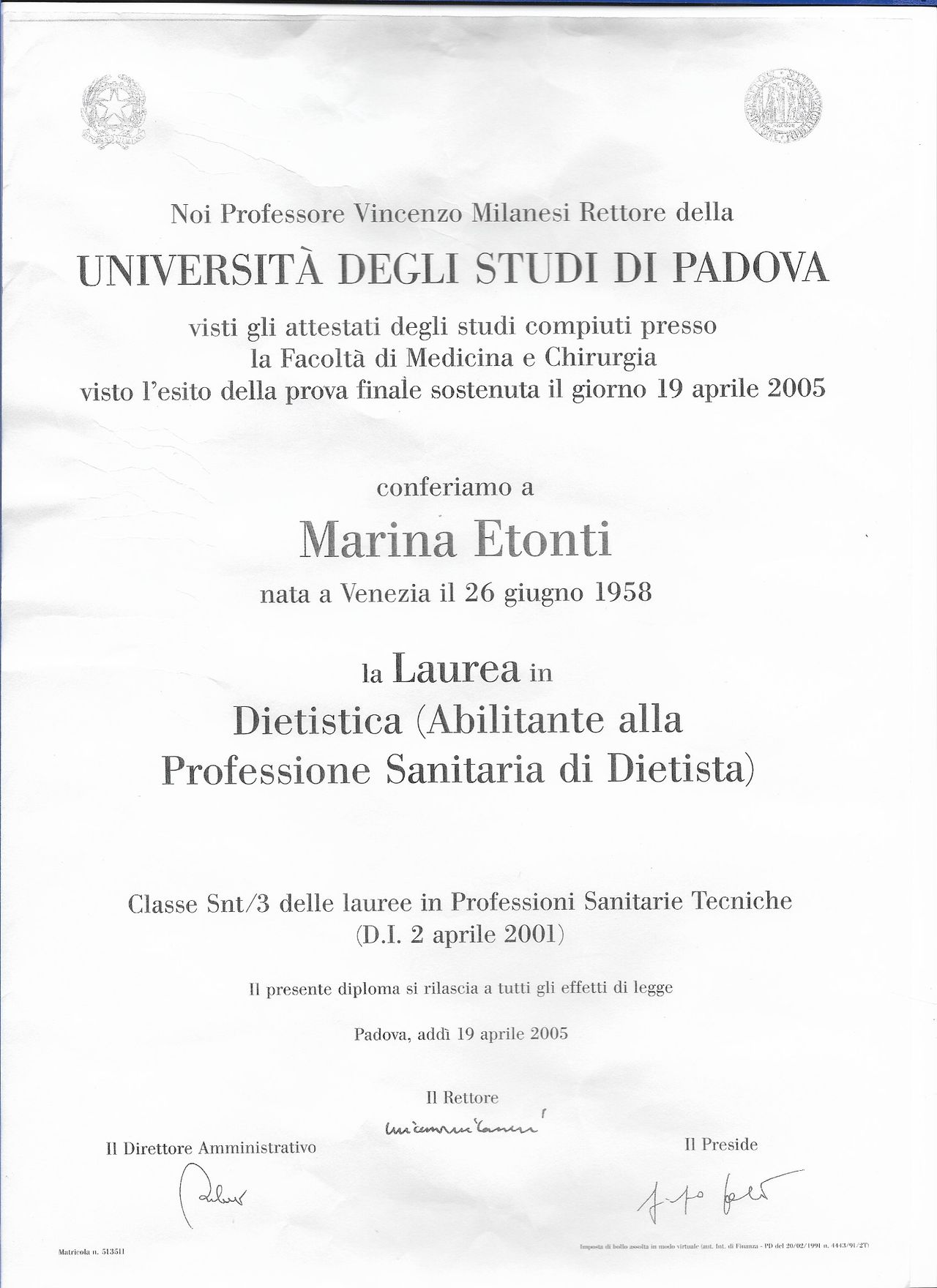 Mi chiamo Marina Etonti e sono laureata in dietistica a Padova.