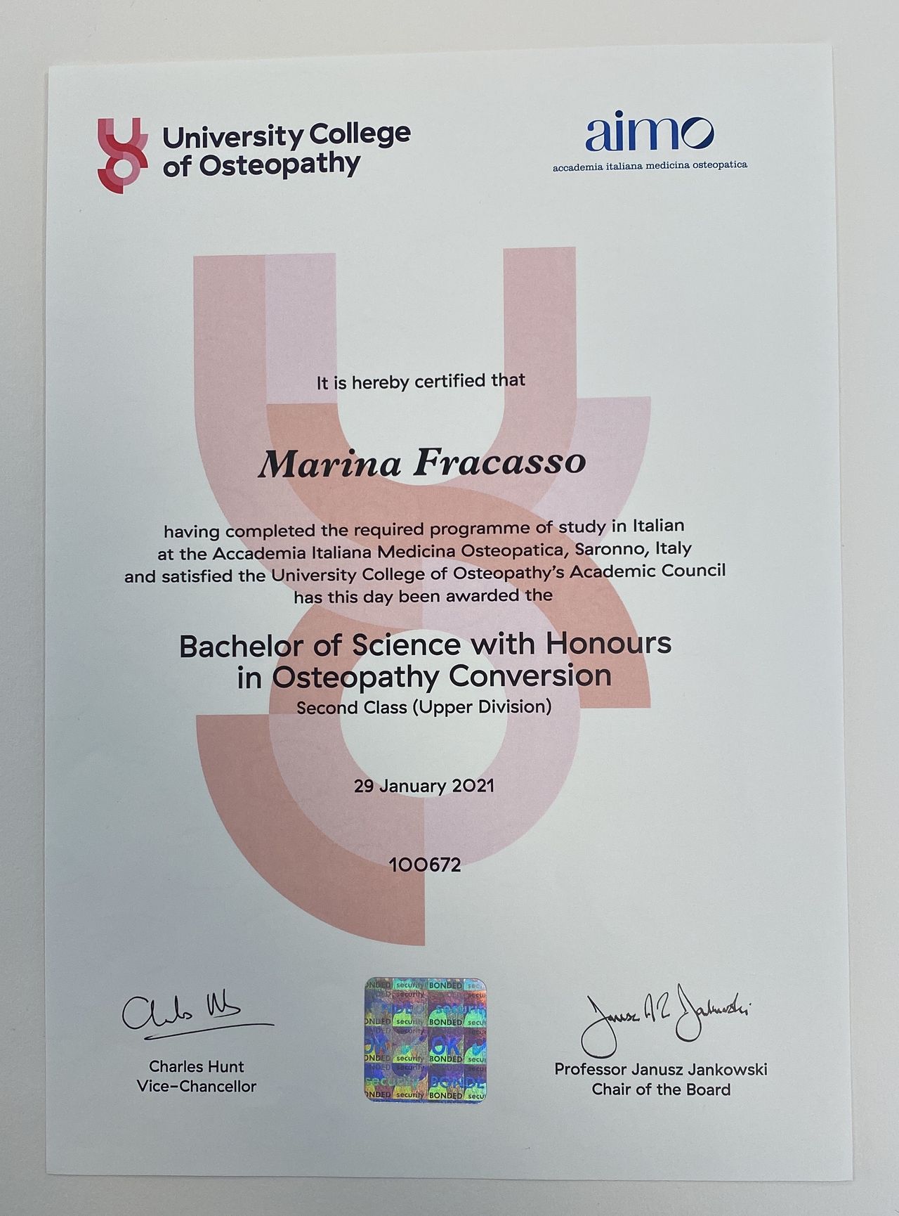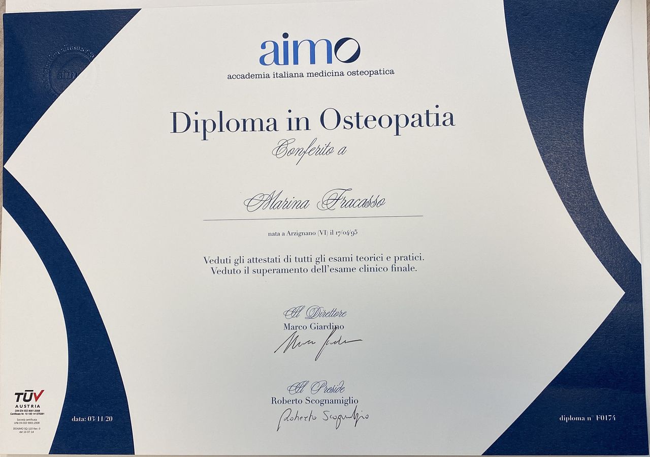 Dopo aver frequentato un corso full time della durata di 5 anni presso l’Accademia Italiana di Medicina Osteopatica (AIMO), nel Febbraio 2021 mi sono diplomata ottenendo il Diploma in Osteopatia D.O. ed un titolo di laurea a valenza internazionale chiamato “Bachelor of Science in Osteopathy” (B.Sc. (Hons) Ost. (UK)) presso la University College of Osteopathy (UCO).