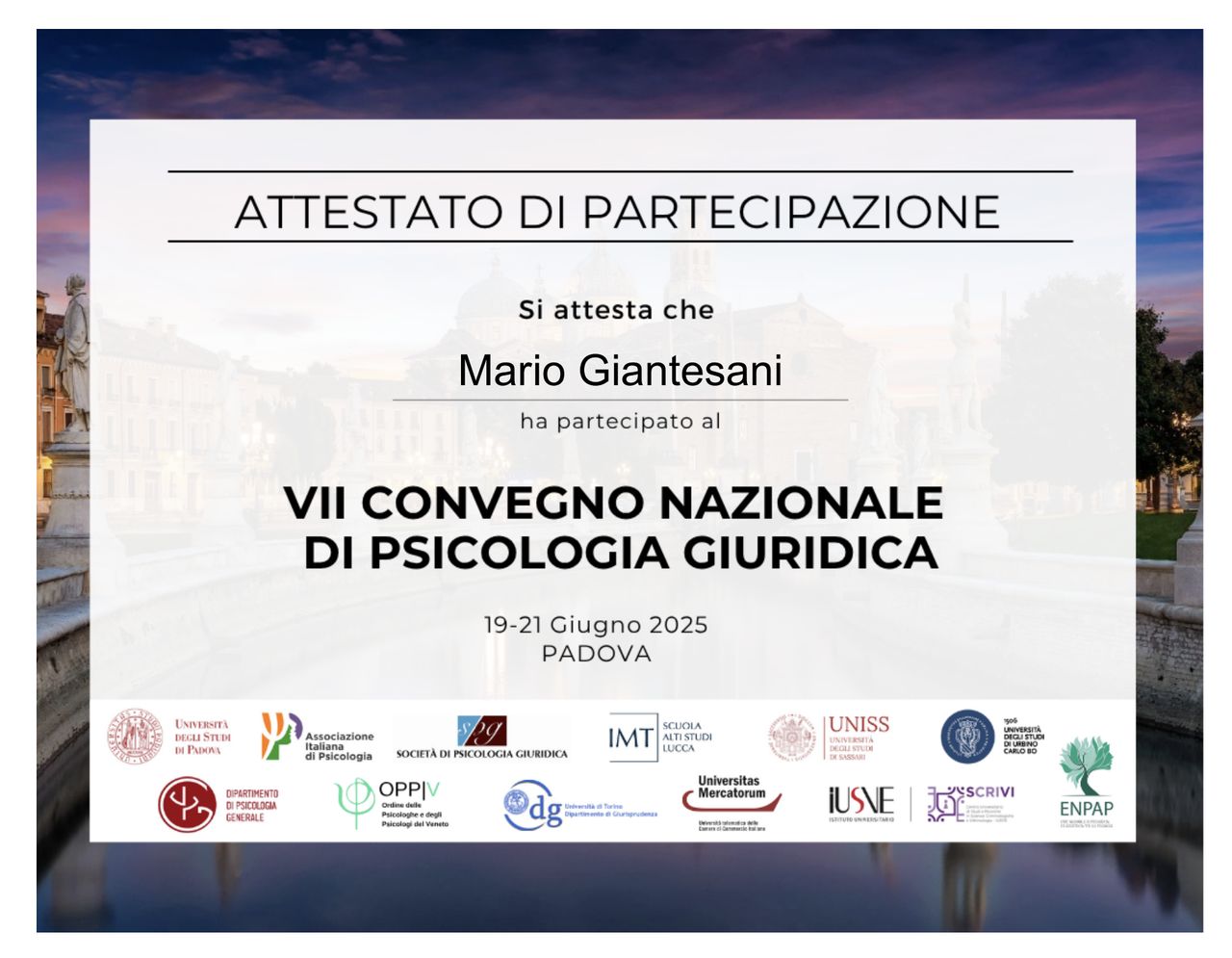 Attualmente sono Dottorando in Psicopatologia e Funzionamento Mentale e Specializzando in Psicoterapia Cognitivo-Comportamentale. Ho conseguito la Laurea Magistrale in Psicologia Giuridica, Forense e Criminologica e un Master in Psicodiagnostica per la valutazione clinica, forense e medico-legale