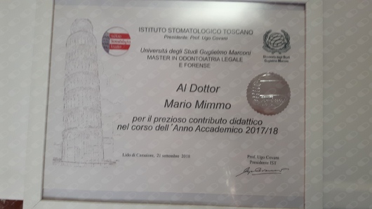 ho avuto l'onore di partecipare come relatore a 3 corsi master di odontoiatria legale dell'università degli studi Guglielmo Marconi presso l'istituto stomatologico toscano sviluppando temi inerenti l'odontoiatria geriatrica