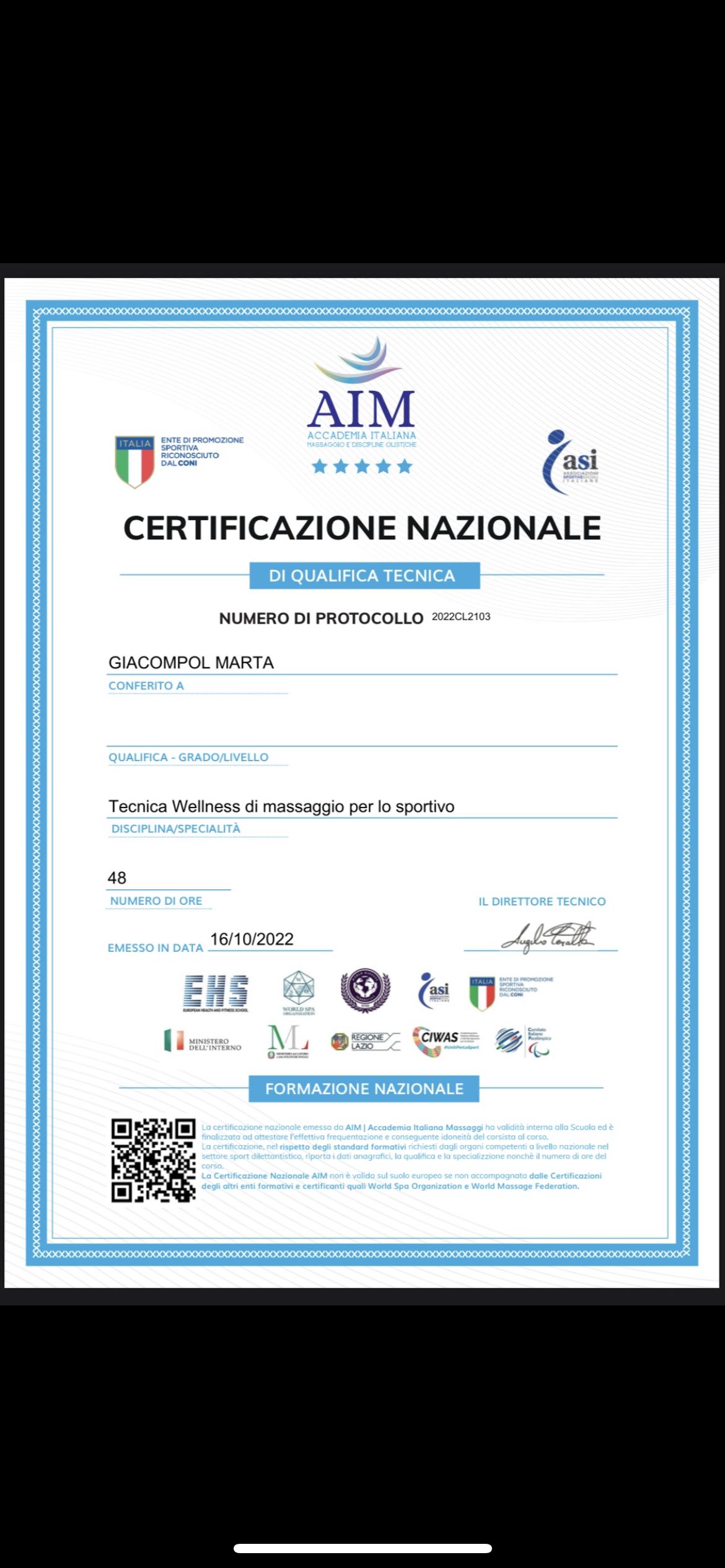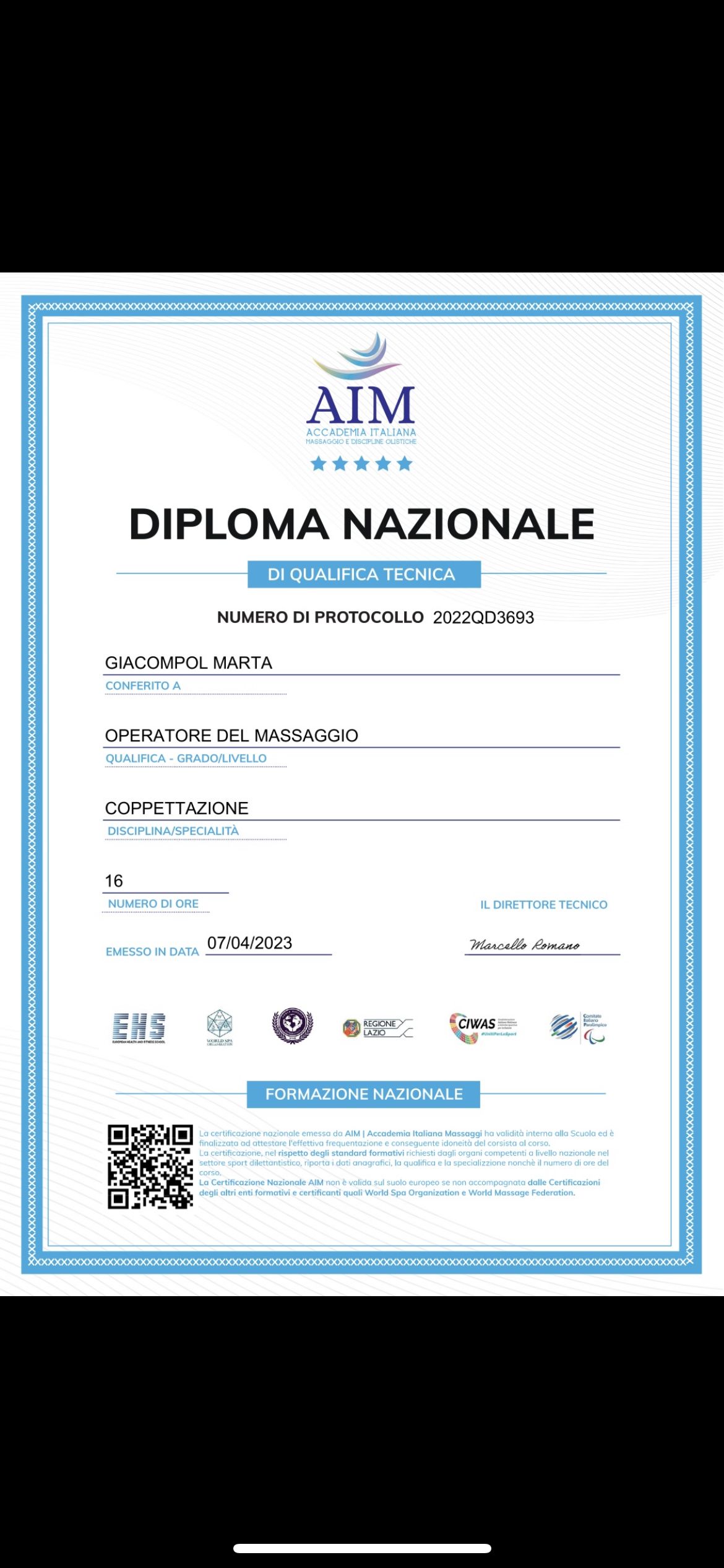 Parallelamente, ho ottenuto anche i diplomi in massaggio sportivo e coppettazione, integrando così ulteriori strumenti utili al trattamento e alla prevenzione di molteplici disturbi muscolari e posturali.