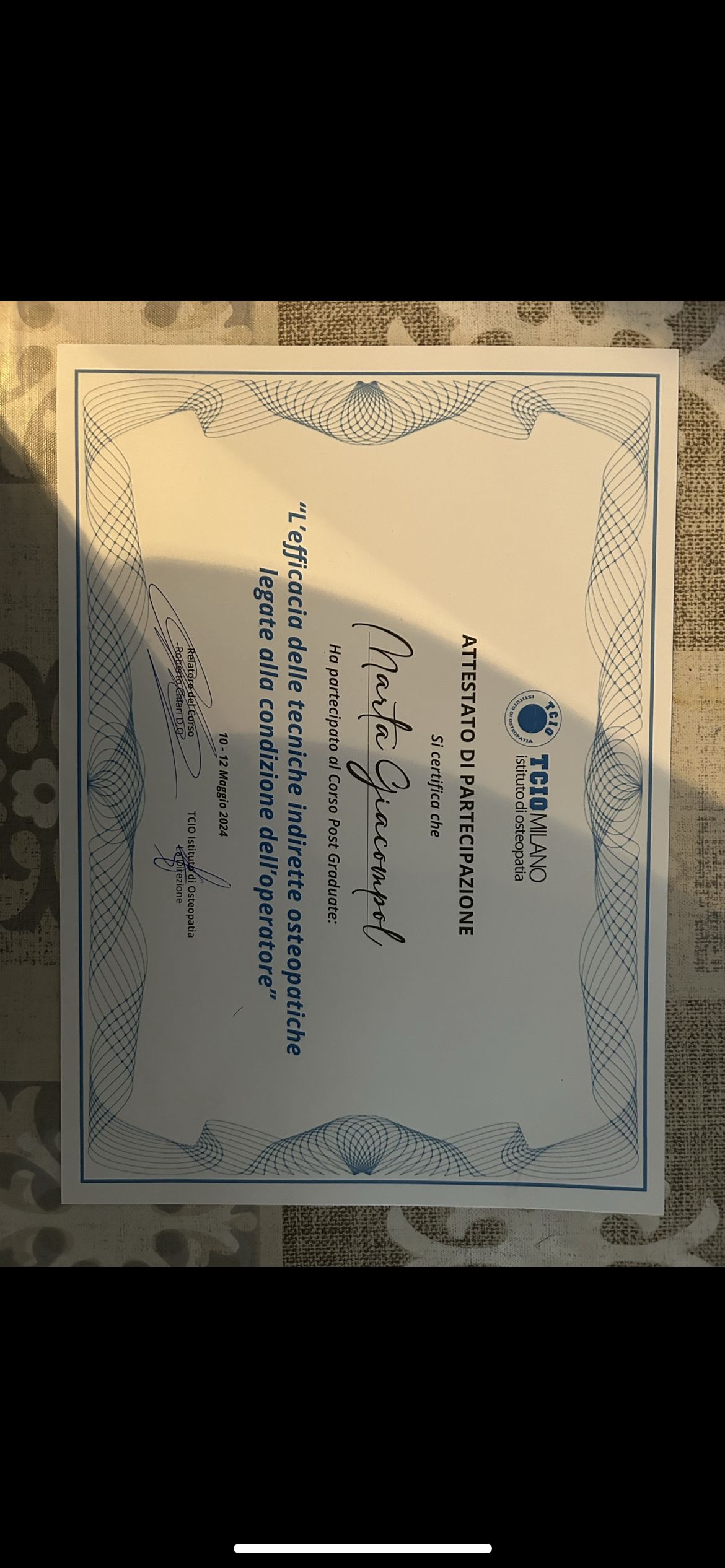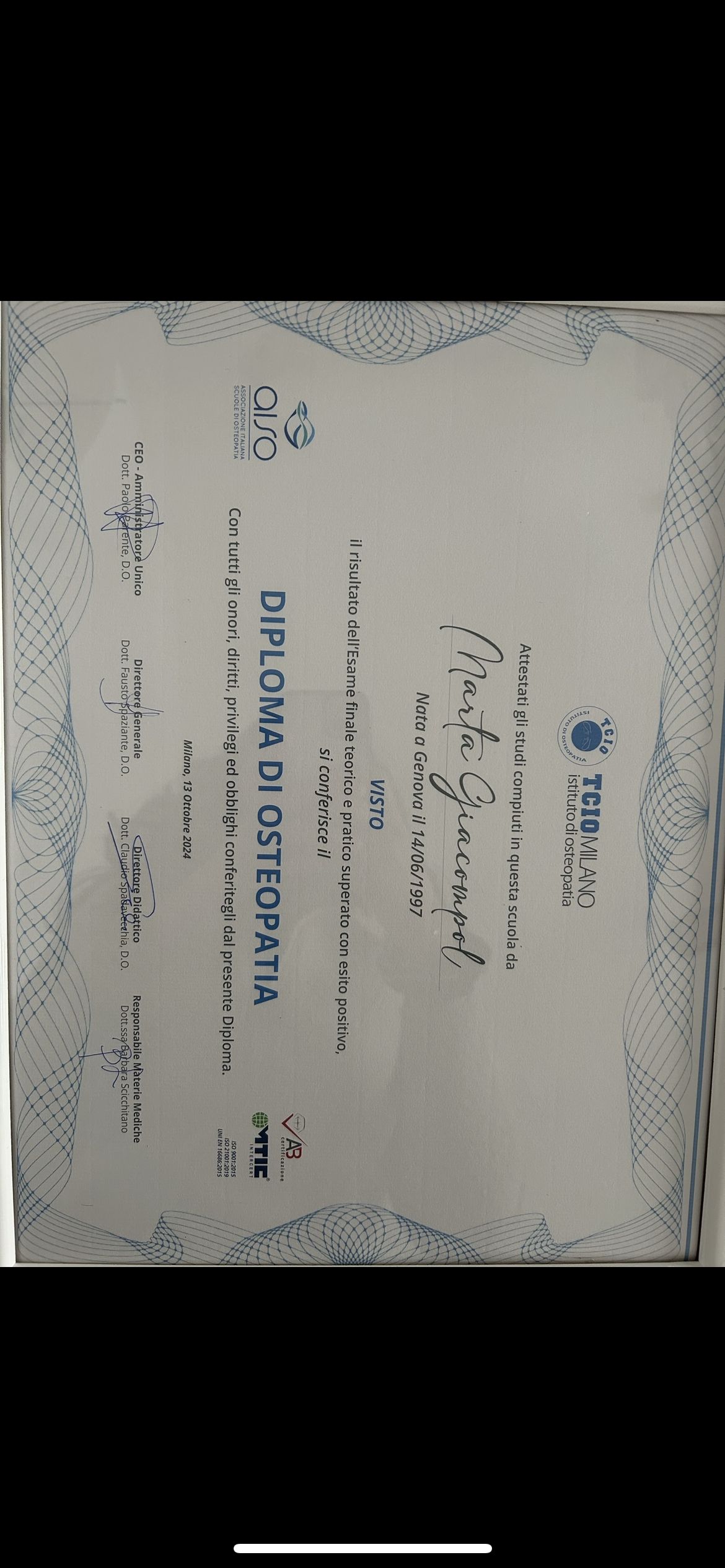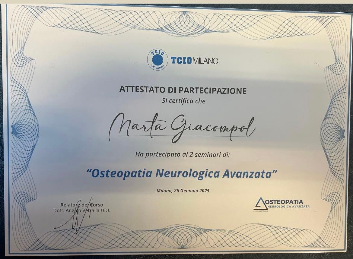 Dopo aver conseguito il diploma in osteopatia presso il TCIO ho proseguito il mio percorso con due corsi post-graduate presso il medesimo istituto, approfondendo specifici ambiti clinici che mi permettono oggi di offrire trattamenti personalizzati e efficaci.