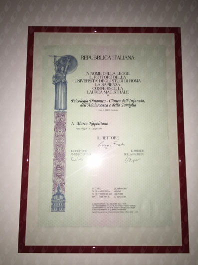 Sono Marta Napolitano, psicologa dinamico-clinica dell'infanzia, dell'adolescenza e della famiglia, laureata all'Università degli Studi "La Sapienza" di Roma. Ho proseguito la formazione post lauream a Napoli. E qui ho cominciato e continuo ad esercitare come libero professionista.
