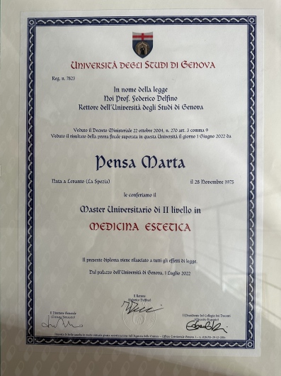 Sempre pronta a perfezionarmi, decido nel 2021 di iscrivermi ad un Master Universitario di II livello in Medicina Estetica presso l'Università di Genova.