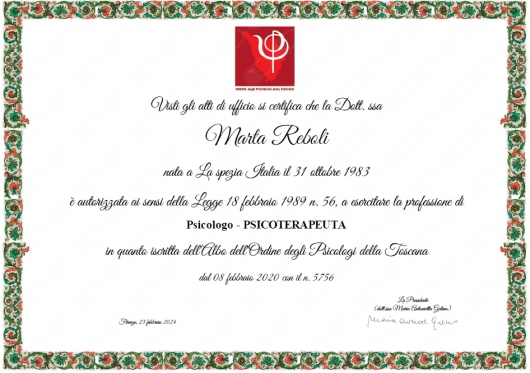 L'incontro, durante la formazione professionale, con la dottoressa Reboli è stato per me molto importante. Mi hanno colpito la sua professionalità, la disponibilità al confronto, l'apertura a molteplici interessi e stimoli formativi. La passione che la caratterizza insieme alla determinazione sono state per me stimolo di crescita. Ringrazio la dottoressa per il confronto, la sua gentilezza ed empatia.