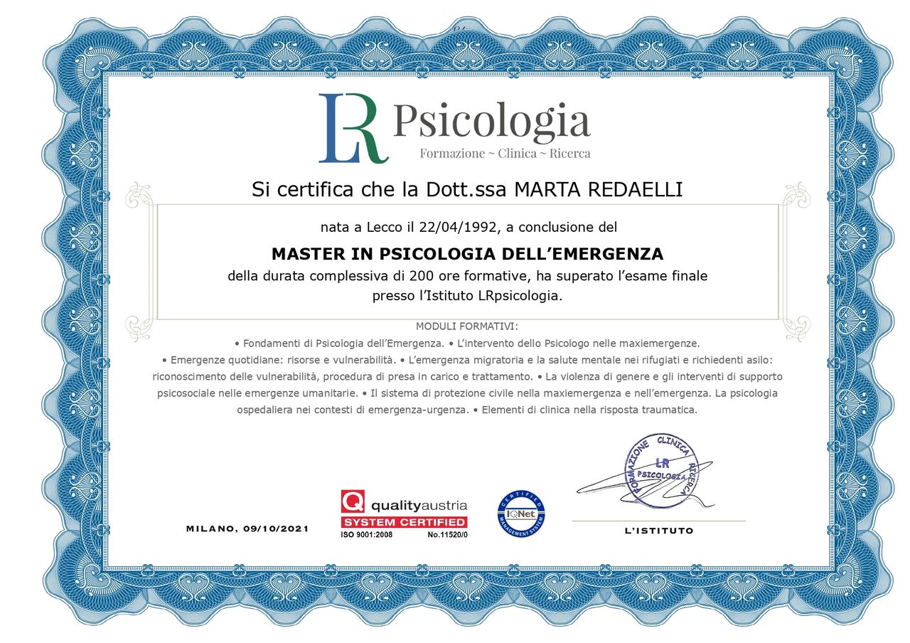 Esperienza più che positiva! La dott.ssa Redaelli è stata capace sin da subito di farmi sentire a mio agio, si è dimostrata molto empatica ed attenta, facendomi sentire ascoltato.