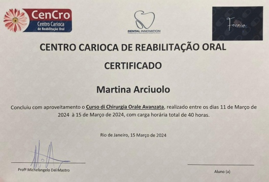 Ho effettuato per la prima volta la pulizia dentale presso lo studio odontoiatrico della Dott.ssa e sono rimasto molto soddisfatto. Oltre alla sua grande professionalità, che sorprende nonostante la giovane età, ho apprezzato in modo particolare la sua empatia. Mi ha fatto sentire a mio agio e compreso, soprattutto perché non ero al massimo della forma. Un'esperienza positiva che mi ha convinto a tornare sicuramente. Consiglio vivamente la Dott.ssa Martina Arciuolo a chiunque cerchi competenza e attenzione verso il paziente.