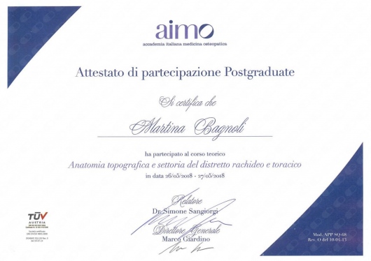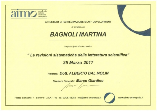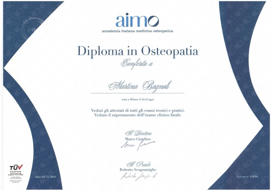 Mi sono diplomata nel 2016 in osteopatia presso l’Accademia Italiana di Medicina Osteopatica (AIMO) di Saronno. Ho frequentato un corso full time di 5 anni. Oltre al Diploma in Osteopatia rilasciato da AIMO possiedo un B.Sc. (Hons.) Ost. rilasciato dal British College of Osteopathic Medicine (BCOM) di Londra. Durante i 5 anni ho svolto 1200 ore di tirocinio clinico seguendo adulti, anziani e bambini di tutte le età.