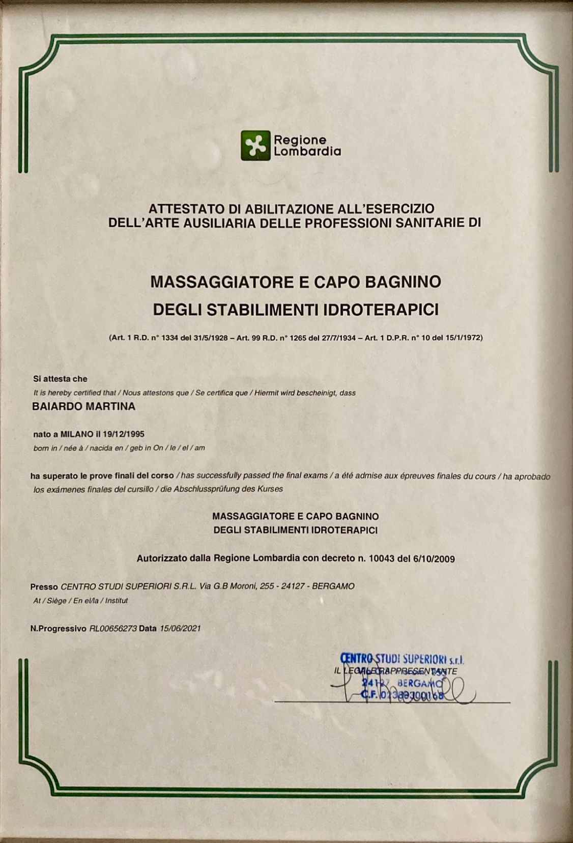 Osteopata diplomata presso il T.C.I.O. di Milano, membro del R.O.I. (Registro Osteopati Italiani) e Massoterapista M.C.B. abilitata presso il Centro Synapsy di Busto Arsizio.