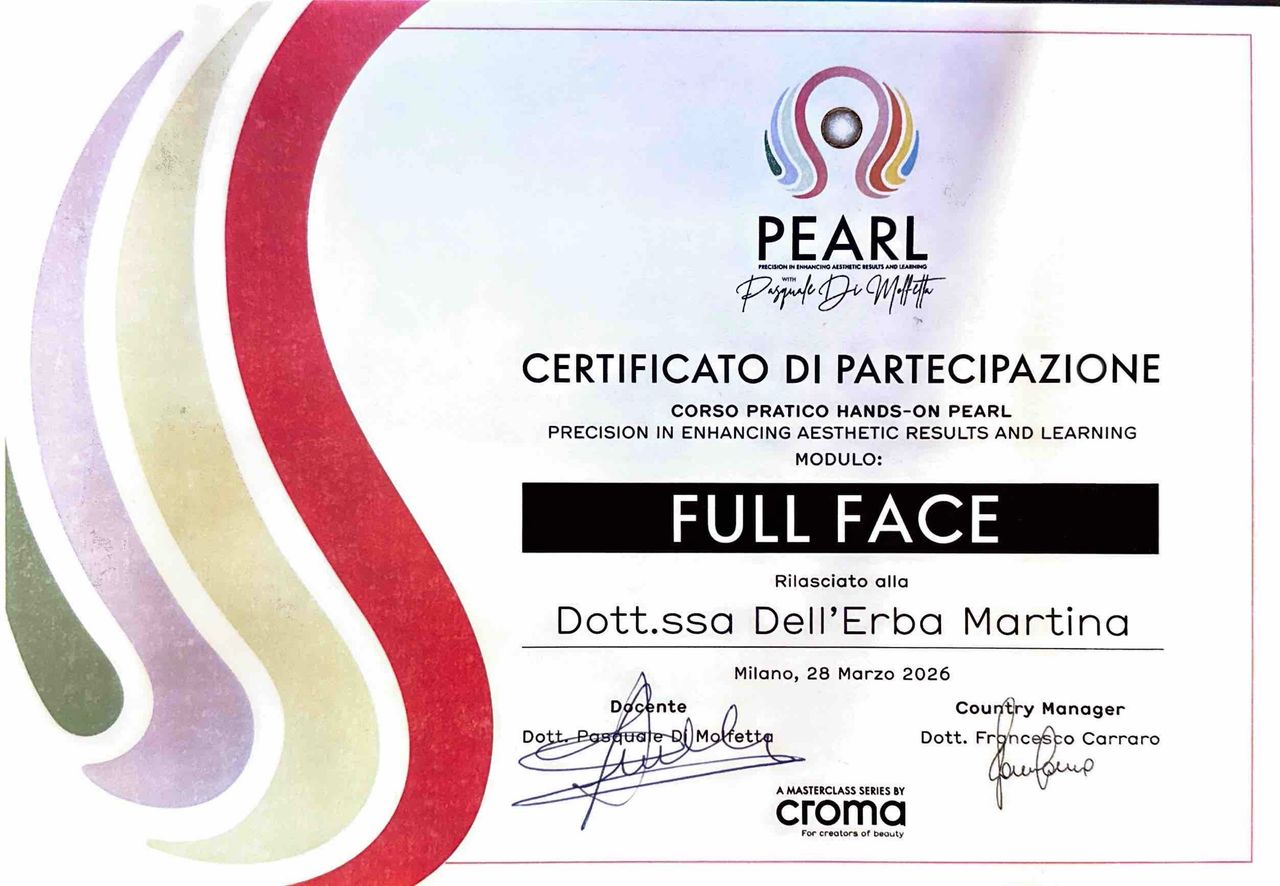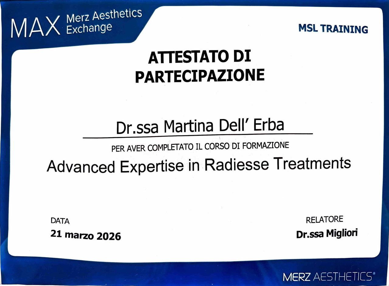 Sono la Dott.ssa Martina Dell’Erba, Medico Chirurgo con specializzazione in Medicina Estetica, Medicina Rigenerativa e Laserterapia. Dopo un percorso formativo internazionale tra Paesi Bassi e Svizzera, dal 2024 esercito con passione e rigore la libera professione a Milano, offrendo trattamenti altamente personalizzati e basati sulle più recenti evidenze scientifiche.