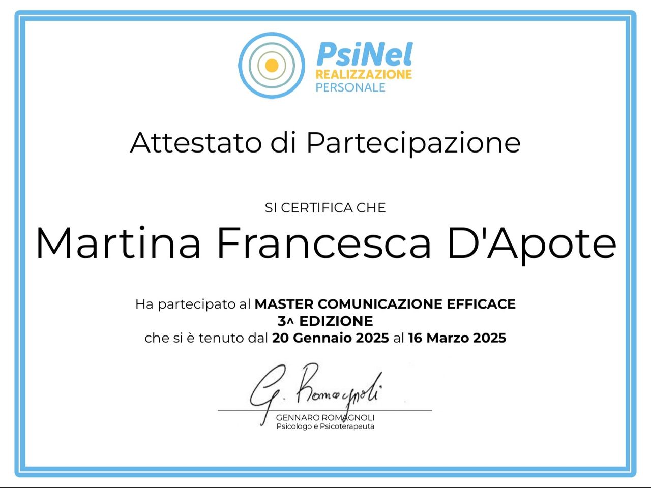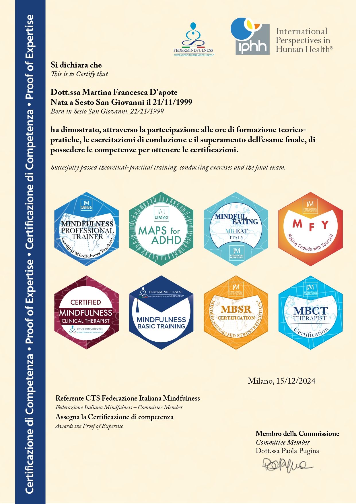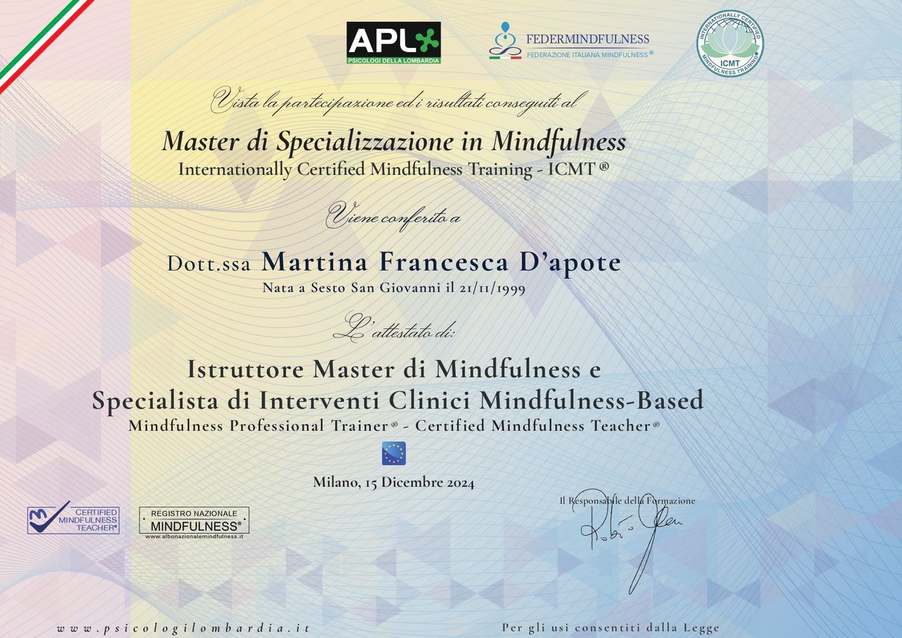 Parallelamente, ho approfondito le tecniche di Mindfulness attraverso un master di specializzazione, al termine del quale ho ottenuto la qualifica di Mindfulness Clinical Therapist & Professional Trainer, arricchendo così il mio approccio clinico con strumenti basati sulla consapevolezza, la presenza e la regolazione emotiva.