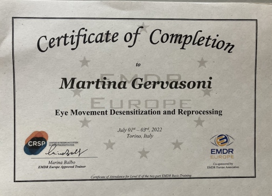 Sono specializzata e mi occupo di disturbo da deficit di attenzione e iperattività (ADHD). Sono co-fondatrice della Cooperativa “ADHD care 360° - Oltre la diagnosi” sull'ADHD: https://www.adhdasdcare360.it/martina-gervasoni/. Essa nasce dalla volontà di professionisti tra cui psicologi, psicoterapeuti ed educatori di offrire servizi volti al miglioramento della qualità della vita delle persone con ADHD. I nostri obiettivi sono il cuore di tutte le attività della Cooperativa ADHD Care 360° - Oltre la diagnosi, impegnandoci a realizzare un impatto positivo nella vita delle persone con ADHD e delle loro famiglie, nella società e nella ricerca