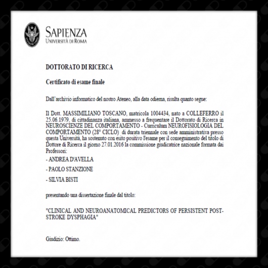 Presso la stessa Università, Dipartimento di Neurologia e Psichiatria, ho conseguito la Specializzazione quinquennale in Neurologia con voto di 70/70 e lode, ed il Dottorato di Ricerca triennale In Neuroscienze del Comportamento (Dipartimento di Psicologia) con giudizio ottimo.