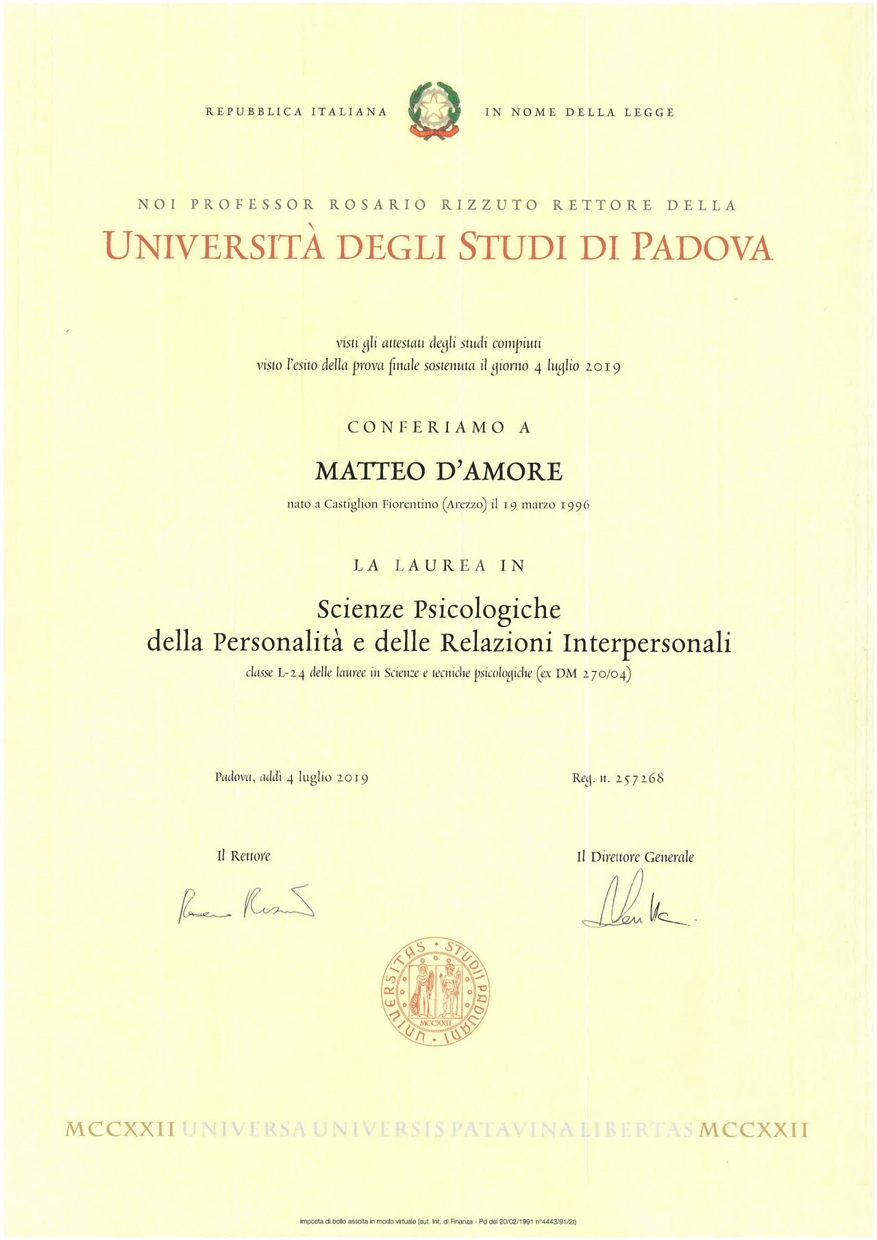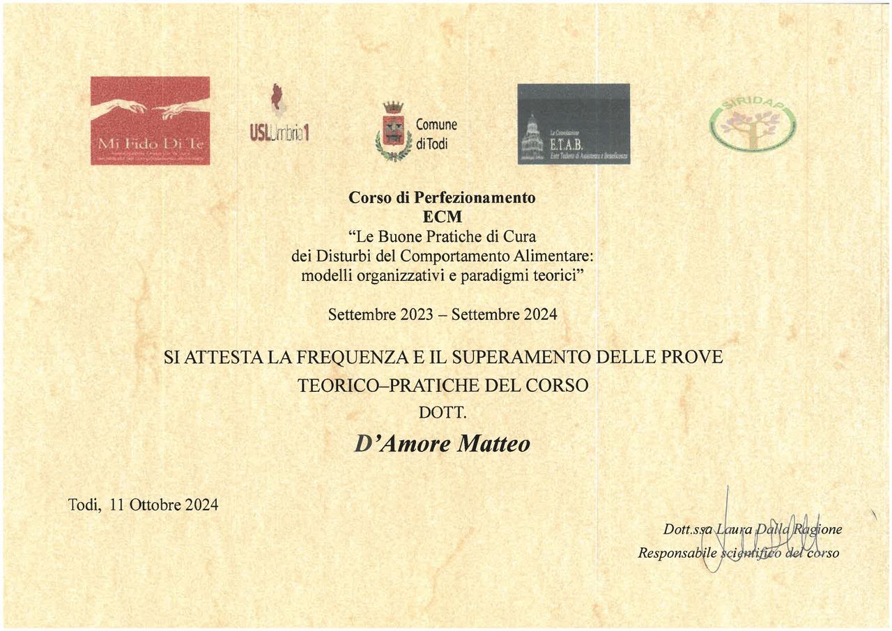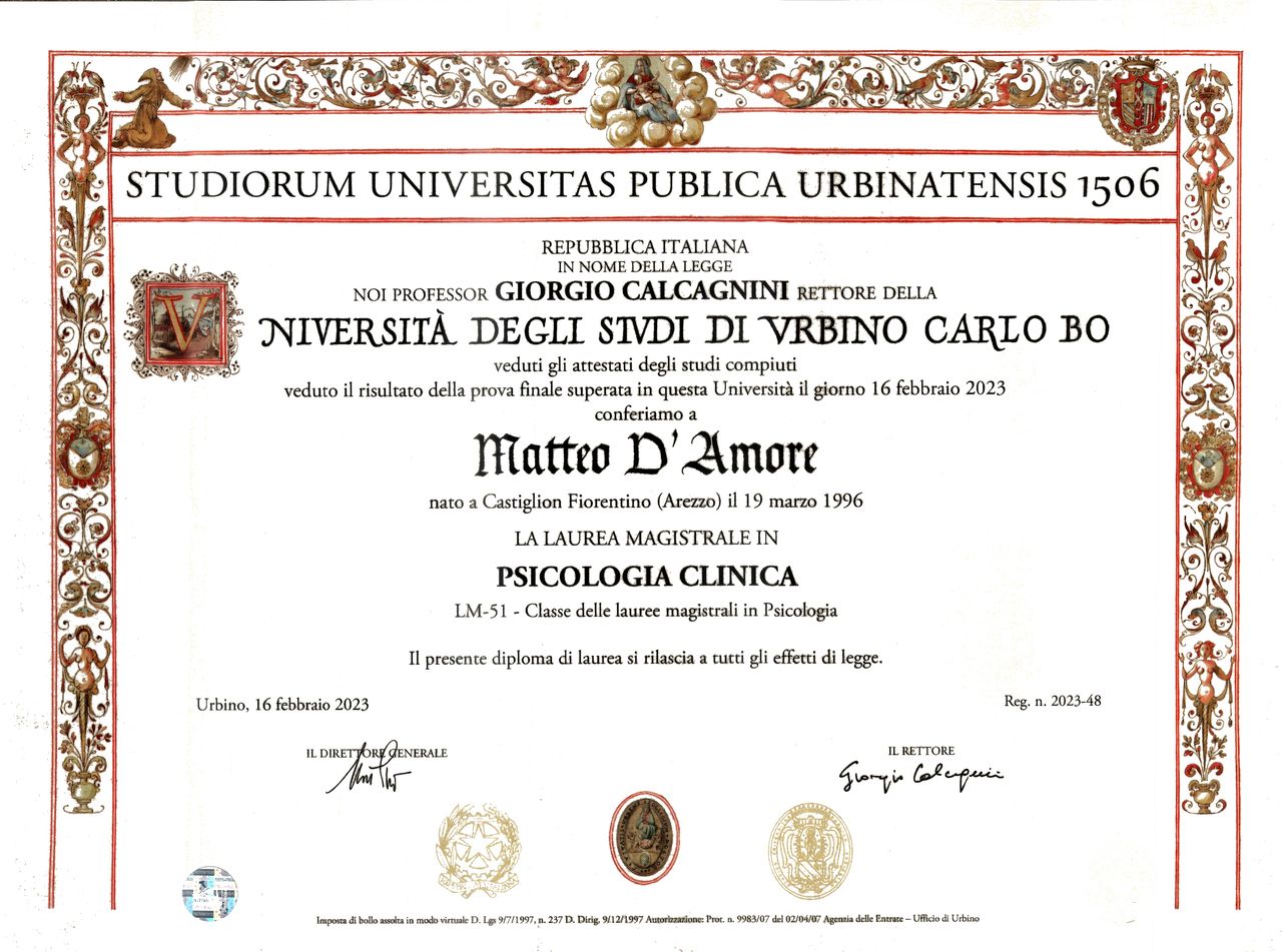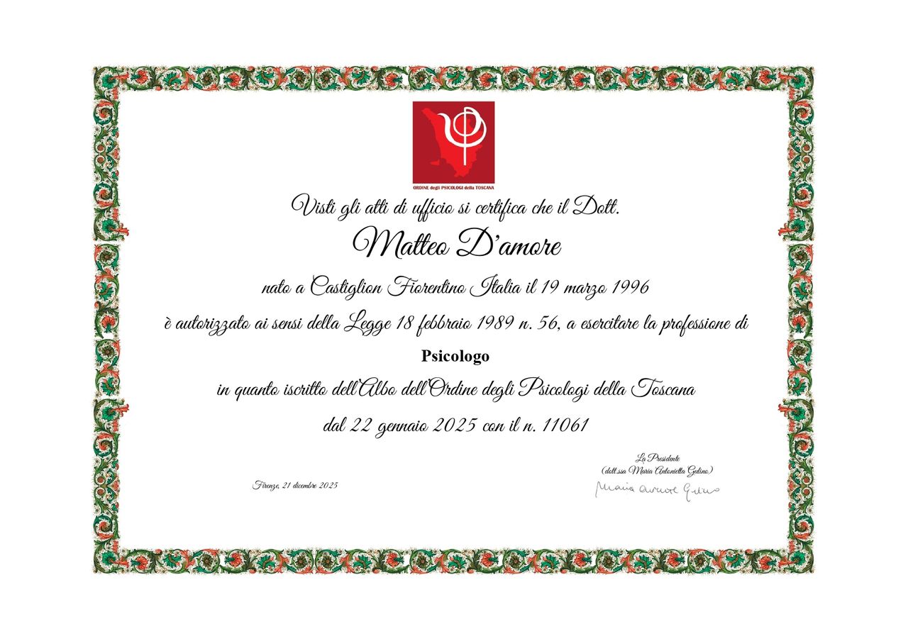 Sono Matteo D’Amore, psicologo iscritto all’Albo della Regione Toscana (n. 11061). Psicoterapeuta in formazione presso la SIAR – Scuola Italiana di Analisi Reichiana, un approccio che integra il lavoro psicologico con la dimensione corporea.