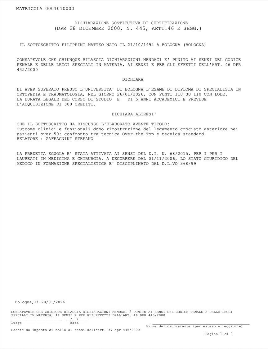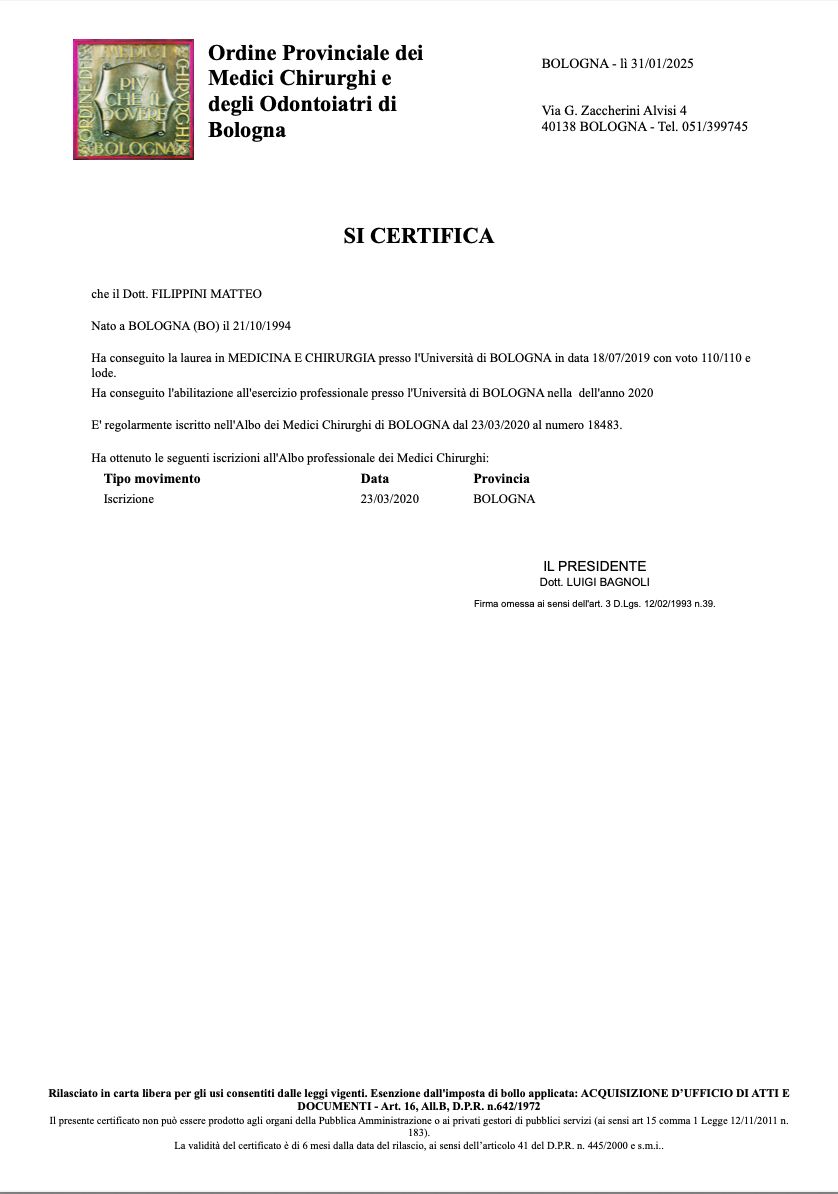 Sono laureato in Medicina e Chirurgia presso l’Università di Bologna e ho conseguito la specializzazione in Ortopedia e Traumatologia presso l’Istituto Ortopedico Rizzoli di Bologna.