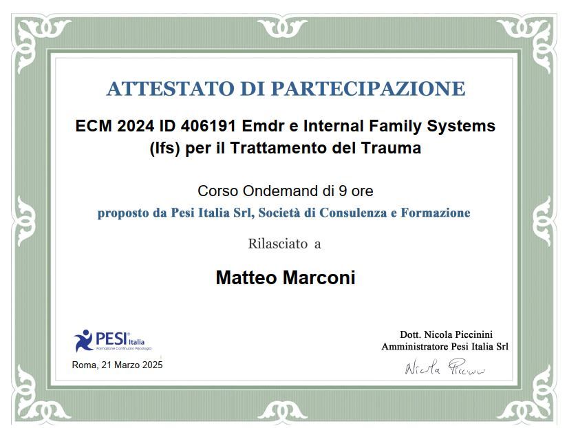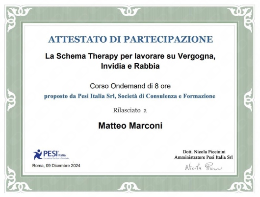 Sono seguito dal dottor Marconi da qualche mese per problemi di ansia, bassa autostima e altro, e nonostante il periodo relativamente breve sento già le conseguenze positive nella vita di tutti i giorni. Mi sono sentito a mio agio e in grado di aprirmi sin dalla prima seduta, il dottore è uno specialista molto preparato che integra varie tecniche specifiche per ogni problema che per ora mi sono risultate tutte efficaci. Mi sento di consigliare vivamente il dottore.