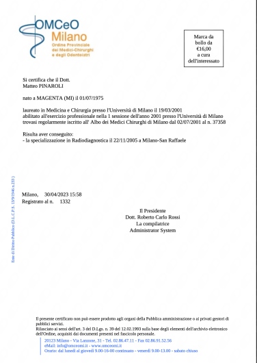 Dal 2006 come medico Radiologo, ho prestato servizio in ospedali privati di Milano e dopo un'esperienza in Cantone Ticino sono stato assunto per concorso pubblico all'ospedale Fornaroli di Magenta dove rivesto il ruolo di Dirigente Medico.