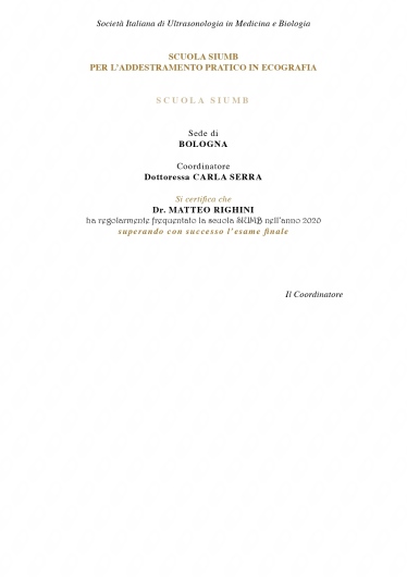 In seguito ho ottenuto la Specializzazione in Nefrologia e Dialisi presso l'IRCCS Azienda Ospedaliero-Universitaria Policlinico Sant'Orsola di Bologna nel 2020 con il voto di 110/110 e Lode.