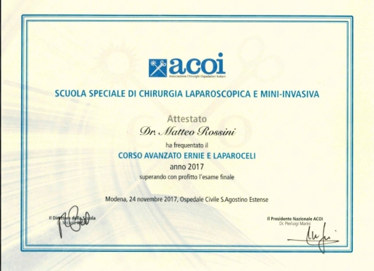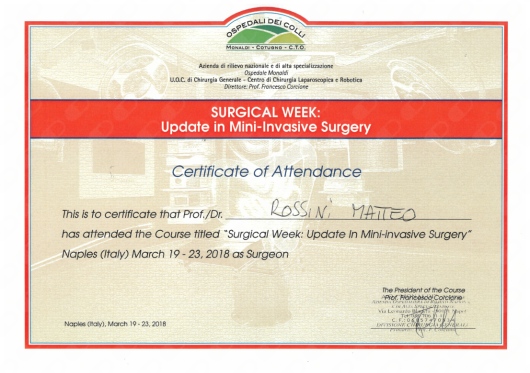 Ho appreso recentemente le tecniche robotiche per il trattamento delle patologie della parete addominale eseguendo interventi di chirurgia robotica con Robot DaVinci in uso presso l'Azienda Ospedaliero Universitaria di Parma.
