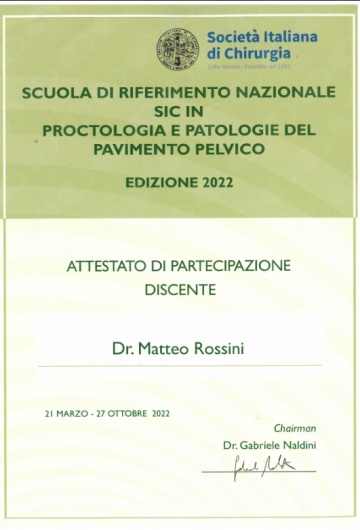Ho avuto occasione di seguire una fellowship presso l'Unita di Chirurgia del colon e del retto dell'Hospital Vall'd'Hebron di Barcelona nel 2023 e dallo stesso anno sono docente del Master in Chirurgia del Pavimento Pelvico dell'Università degli studi di Parma dove tratto tematiche riguardanti le metodiche per la cura dell'incontinenza fecale e della sindrome da ostruita defecazione oltre alle tematiche classiche della proctologia.