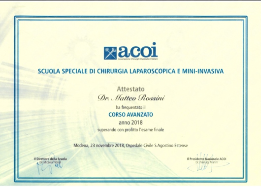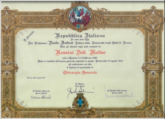 Iscritto all'albo dei Medici di Parma ho ottenuto la specializzazione in Chirurgia Generale con lode nel 2019 presso l'Università di Parma dapprima come medico in formazione presso l'U.O. Clinica Chirurgica Generale e dei Trapianti d'Organo e quindi presso la U.O. di Clinica Chirurgica Generale.