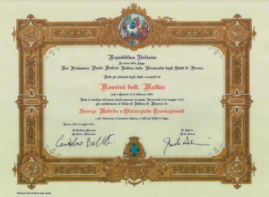 All'ultimo anno di formazione ho ottenuto l'accesso al dottorato di Ricerca in Scienze mediche e Chirurgiche traslazionali completando il PhD nel 2022.