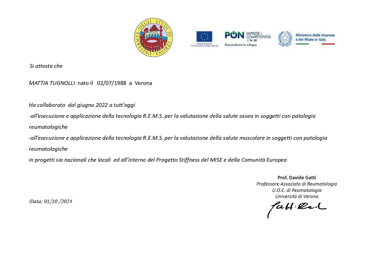 Un aspetto che mi distingue è l’esperienza in ambito muscolo-scheletrico: svolgo attività di ricerca presso l'unità di Reumatologia dell’AOU Integrata di Verona ed ho esperienza con tecnologia REMS per valutazioni legate a qualità ossea e muscolare, utili soprattutto in ottica di prevenzione (ad esempio in menopausa) e di miglioramento della funzionalità.