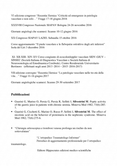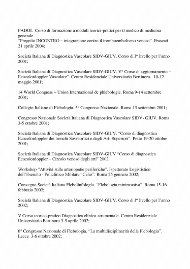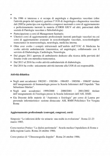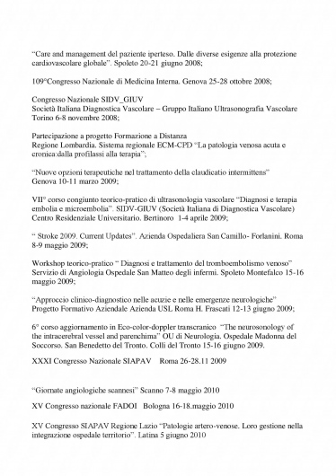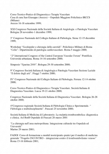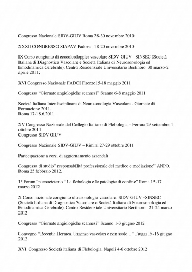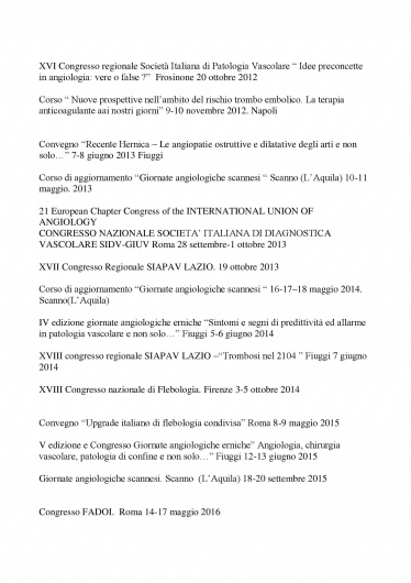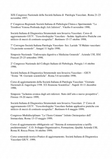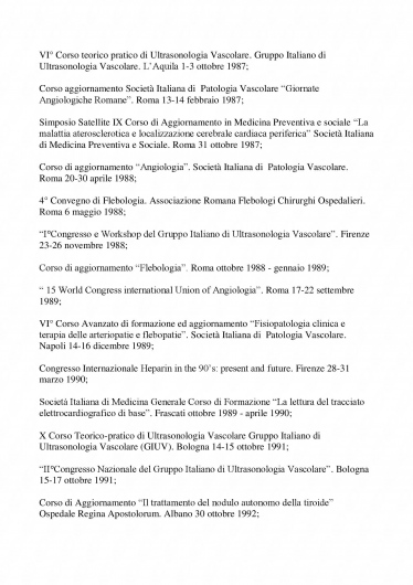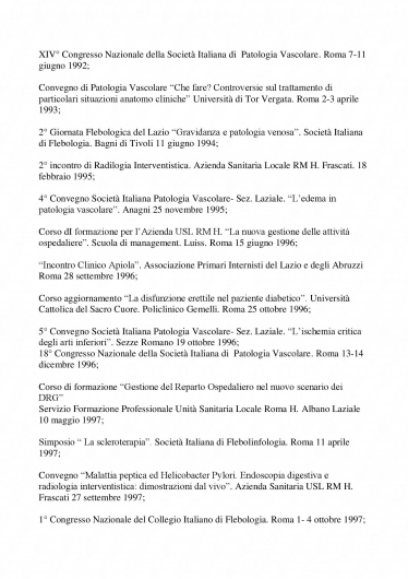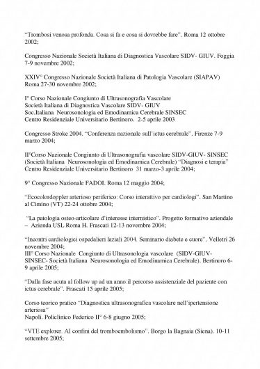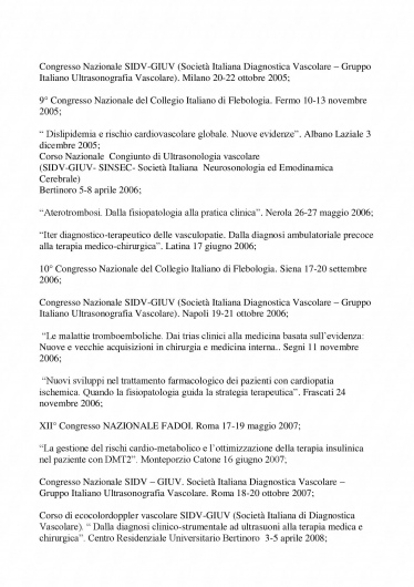 Dal 1986 si interessa e si occupa di angiologia e diagnostica vascolare e partecipa con regolarità a congressi nazionali e corsi di aggiornamento e perfezionamento inerenti la materia (CORSI GIUV ed altri, patrocinati dalle società di Patologia vascolare e flebolinfologia).