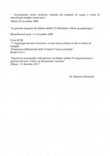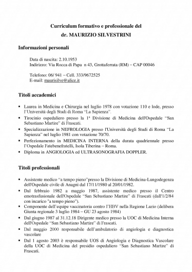 Dal giugno 1987 al dicembre 2018 il dott. Maurizio Silvestrini è stato Dirigente medico presso la UOC di Medicina Interna dell'Ospedale San Sebastiano Martire di Frascati.