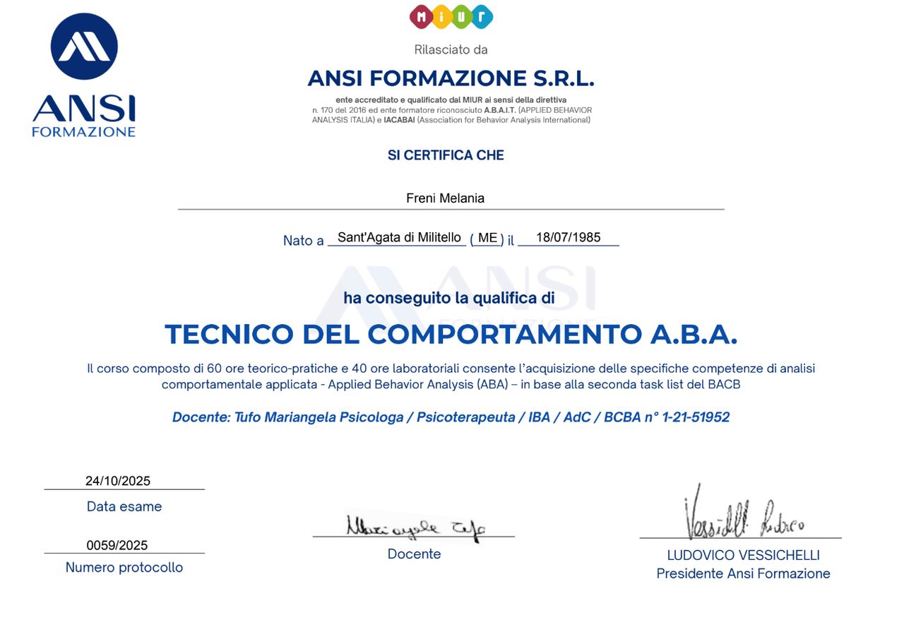 Sono inoltre formata come Tecnico del Comportamento A.B.A., un metodo applicato soprattutto con bambini e ragazzi con disturbi del neurosviluppo (come l’autismo), utile per favorire l’acquisizione di nuove abilità e la gestione dei comportamenti problematici.