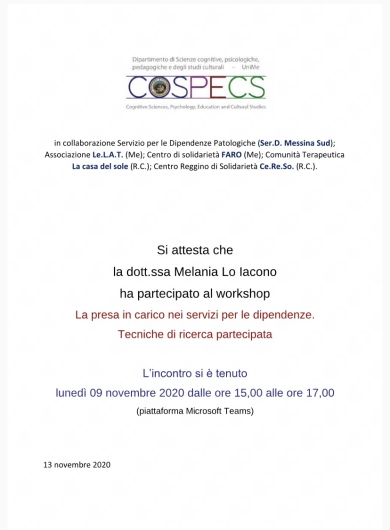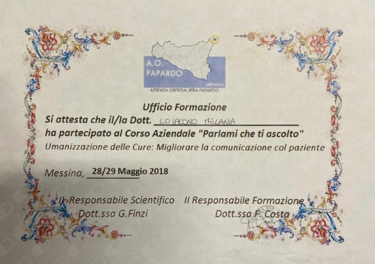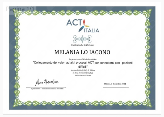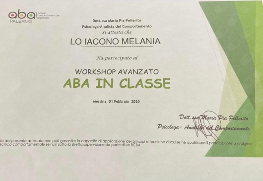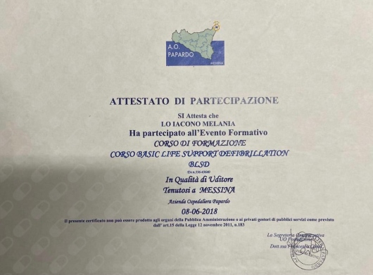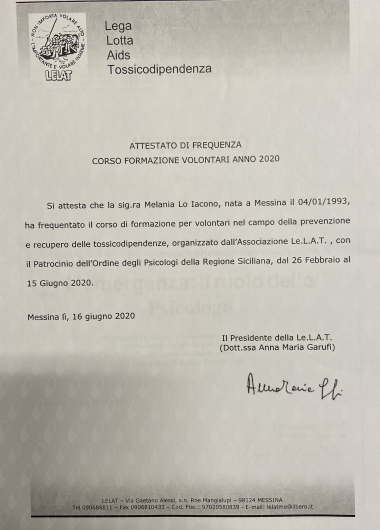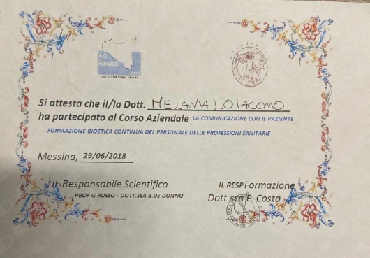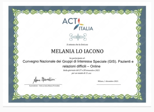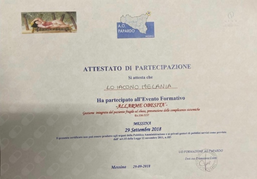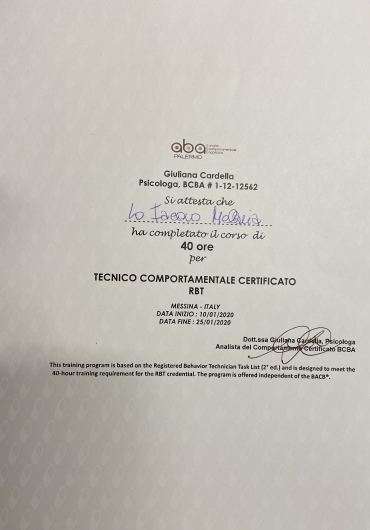 Nel 2019 sono stata Relatrice al convegno “Mai più nascosta” segni, decorso, esiti e trattamento della corea di Huntington, svoltosi presso l'Azienda Ospedaliera Papardo di Messina. Nel 2020 ho conseguito il corso per Tecnico Comportamentale Certificato RBT e il corso di formazione per volontari presso la comunità per tossicodipendenti Le.L.A.T. di Messina.