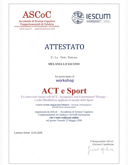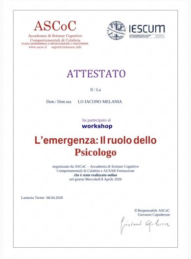Nel 2023 ho conseguito il diploma di specializzazione in Psicoterapia presso l'Accademia di Scienze Cognitivo Comportamentali di Calabria (ASCoC).