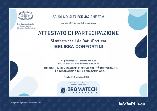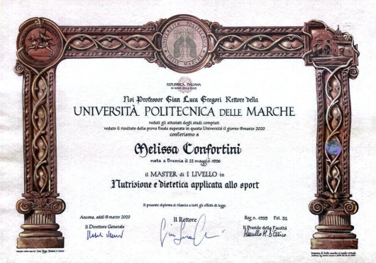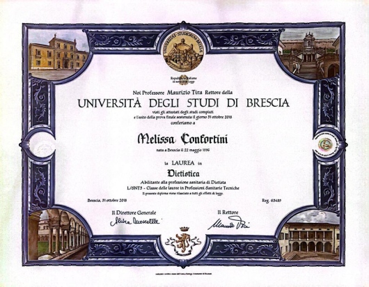 Sono iscritta all’Ordine delle Professioni Sanitarie (TRSM) nell’Albo dei Dietisti, inoltre sono tutor di tirocinio per l’Università Telematica San Raffaele di Roma e collaboro con Project InVictus.
