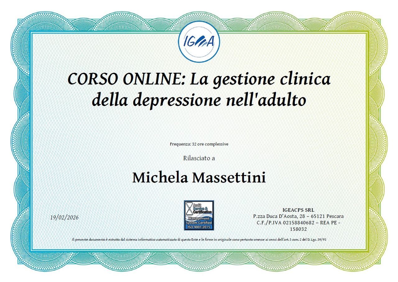 Conosco la Dott.ssa Massettini da molto tempo e ha sempre dimostrato una spiccata sensibilità e una comprensione non comune. Ora mi sono rivolto a lei per superare uno stato depressivo (distruttivo) che va avanti da qualche mese. Le sue osservazioni sono sempre di aiuto e mi portano a considerare nuovi punti di vista sul valore della mia esistenza. Consigliatissima.