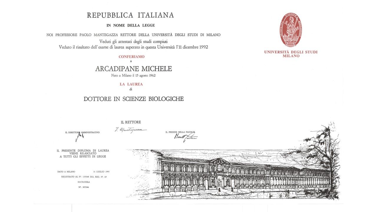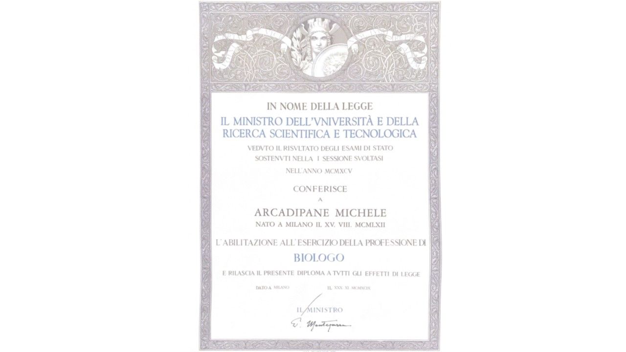 – laurea in Scienze Biologiche (Università degli Studi di Milano. Facoltà di Scienze MM. FF. NN. a.a. 1992-93)