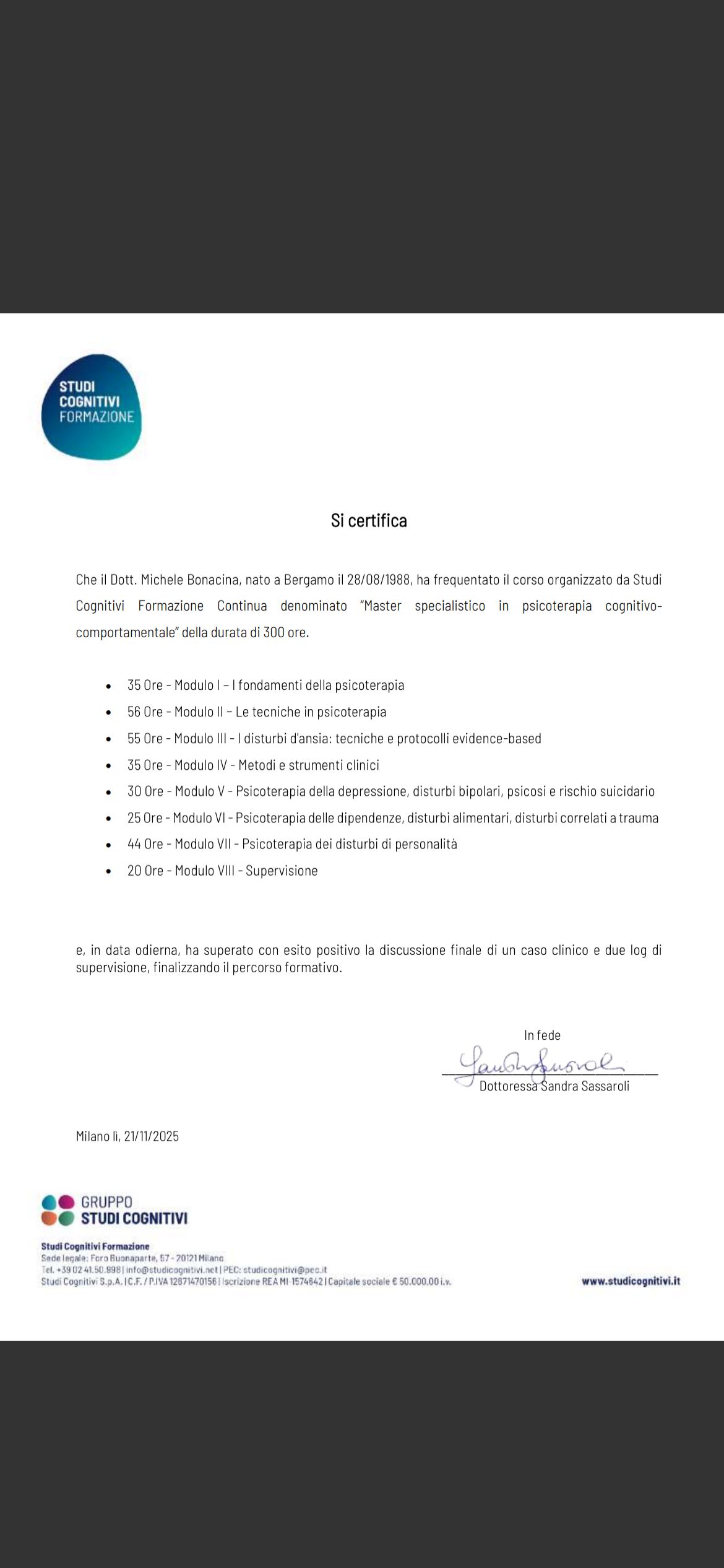 Sono Michele Bonacina, psicologo psicoterapeuta, e credo che chiedere aiuto sia un atto di coraggio e consapevolezza. Se stai vivendo un momento di difficoltà, ansia, stress o confusione emotiva, un percorso psicologico può aiutarti a ritrovare equilibrio, chiarezza e benessere.
