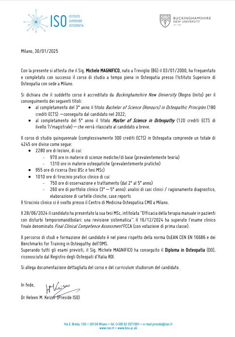 Sono un osteopata laureato presso l’Istituto Superiore di Osteopatia (ISO) di Milano, dove ho completato un percorso quinquennale conseguendo il Diploma in Osteopatia (D.O.). Nel 2024 ho ulteriormente arricchito la mia formazione ottenendo il titolo di Master of Science in Osteopathy (M.Sc. Ost.) presso la Buckinghamshire New University nel Regno Unito.