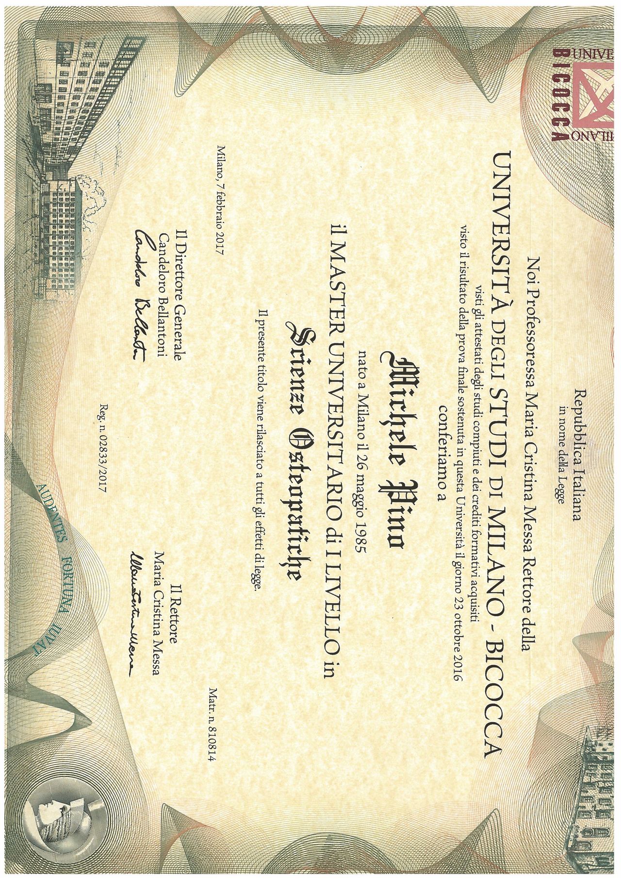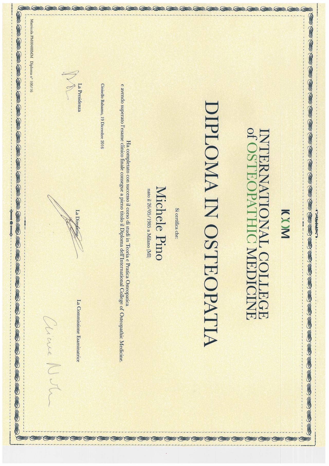 In questi anni ha continuato a formarsi seguendo numerosi corsi di terapia manuale quali il lifodrenaggio metodo Vodder, Masterclass in tecniche dirette HVLA, Metodo Strain Counterstrain e infine conseguendo il diploma di Massoterapia.